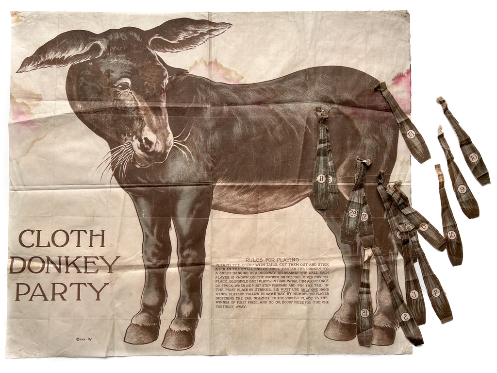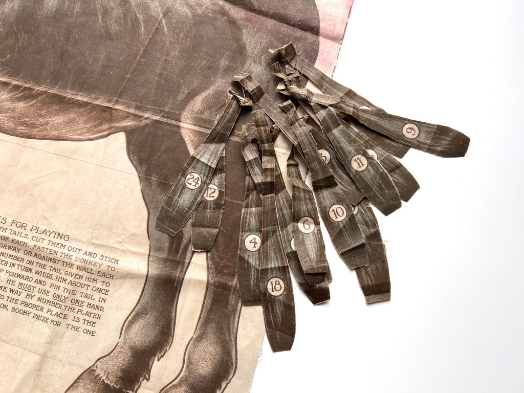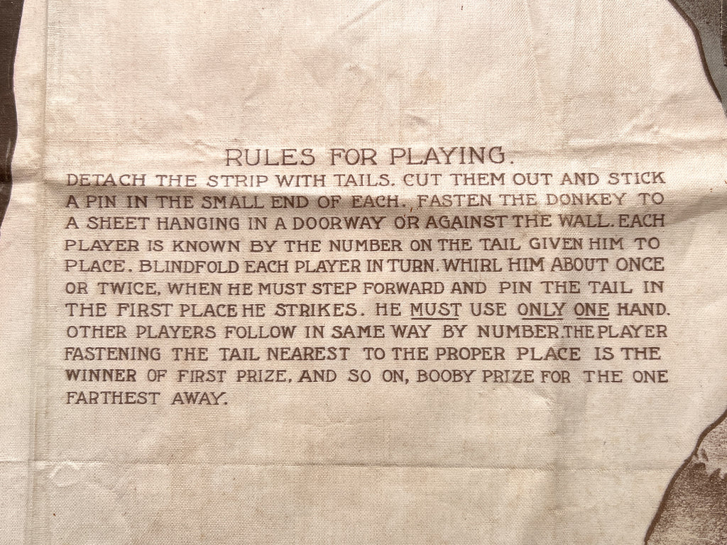 A nice "pin the tail on the donkey," one of the oldest running party games. No moral lessons here. It was introduced in the late nineteenth century, with many publishers producing their own versions, and is still being manufactured today. Originally printed with the tails lined along the right side, to be cut out before play. Directions printed on the cloth.