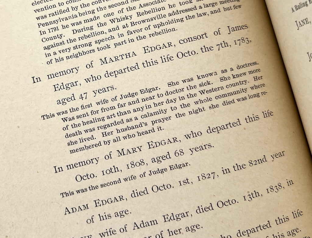 The entry for Martha Edgar (née Smiley, d. 1783), the first wife of prominent judge James Edgar, though Simpson uses the term "consort". He notes that she was "known as a doctress...sent for from far and near to doctor the sick. She knew more of the healing art than any in her day in the Western country. Her death was regarded as a calamity to the whole community..." (28) Of course, you won't find anything about Martha Smiley Edgar elsewhere in history books—a reminder of how remarkable figures are often buried in obscure local history books. Scarce first edition.