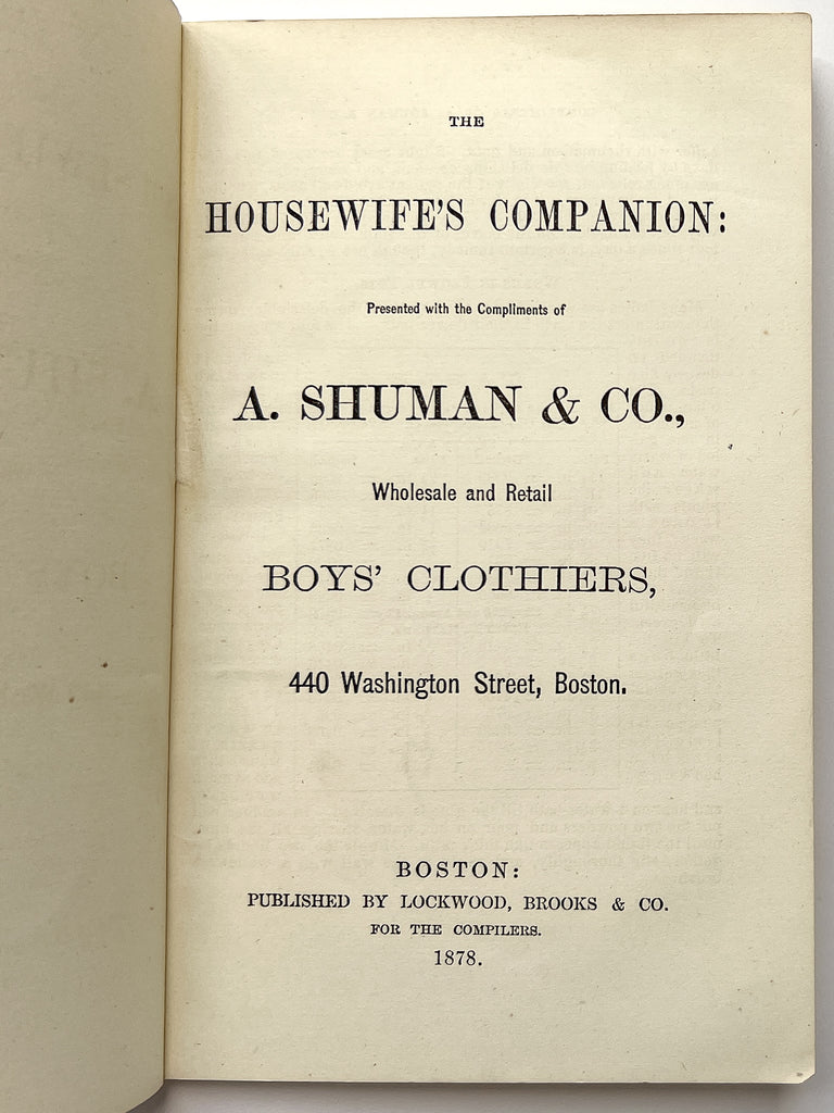 The Housewife's Companion: Presented with the Compliments of A. Shuman & Co., Wholesale and Retail Boys' Clothiers, 440 Washington Street, Boston.