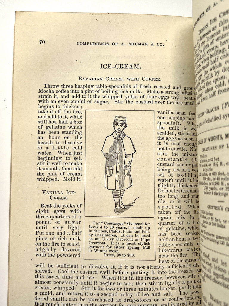 Printed wraps, 12mo, 96pp. An unusually designed trade catalog set within the traditional "household tips and recipes" format promotional book, with inset panels on many pages showing the garments on offer, as well as tables and information about buying. Attributed to Henry M. Mathews, 4 in OCLC.