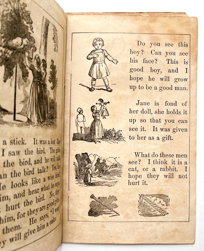 Printed wraps, 12mo, (24) pages. No date; the Davis, Porter & Co. imprint dates it to 1864-1866, when Coates was added. Horizontal crease at the center of the volume, otherwise Very Good with gentle toning and edgewear including short closed tears. Great pictorial alphabets on the first 6 pages--and a vignette on the last page of a poor old man trying to sell books. OCLC shows 5 copies with the later imprint "Davis, Porter & Coates," immediate successor to Davis, Porter & Co., per the AAS trade directory.