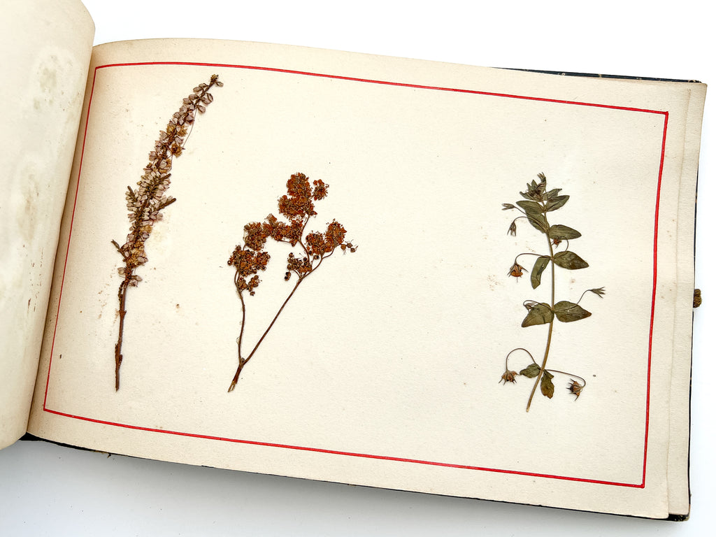 46 album leaves with additional text leaves tipped to stubs. Two drawings and 52 botanical specimens present (labels where specimens have been lost are not counted). Oblong quarter cloth hardcover with marbled boards and woven tie closure, 9.75 x 6.75 x 9.75 inches. Overall Very Good with discoloration and residue from the specimens, light rubbing to extremities.