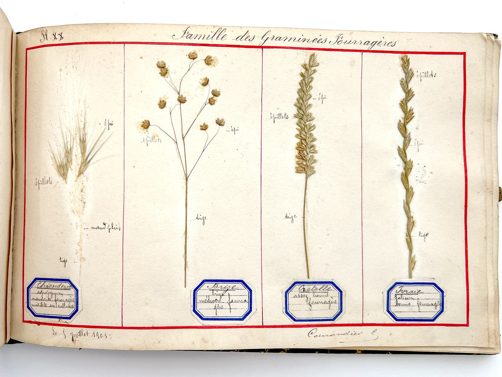 Plates and sections include Germination, Étude du lige, Plant sans fleurs ou cryptogames, Famille des graminées fourragères, Prêtres et fougères, Champignons (Agaric and Chanterelle), Les mousses, Gymnospermes, Angiospermes, graminées fourragères, Monocotyledones, Dicotyledones… Some are identified as taken from a school garden, and the student has a keen eye for observation, evident in the drawings, though is a bit clumsy and irregular with the specimens. Each page ruled in manuscript, small explicatory slips tipped to the tabs of excised pages very neatly trimmed. Later specimens are better and more uniformly preserved (like they got the hang of it).