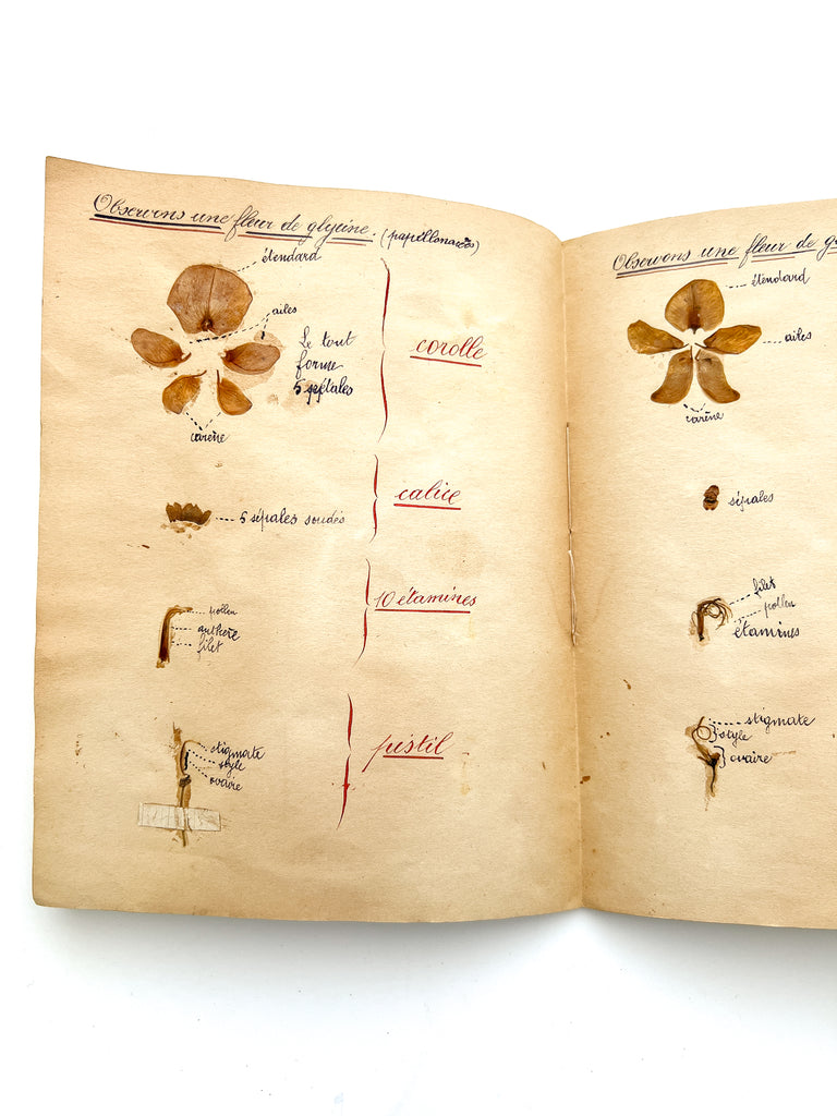 Dessin (printed cover title). Student notebook with (20) pages, (14) full of notes and botanical specimens, with a focus on plant anatomy [calice, corolle, pistil, l’etamines, &c.] 48 labeled specimens/groupings (and 1 missing)—includes seeds and smaller components. Some pages are tidier than others, with one, “Observons une fleur d’iris,” veering toward expressionist collage.