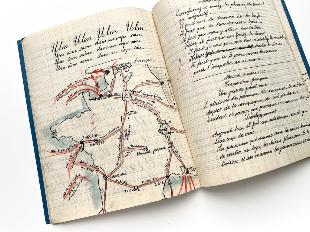 Cahier Victor Hugo (cover title). Softcover quarto in printed wraps, 56 manuscript pages. Minor bleeding to the first page, instructor's markings in red; else Very Good with light handling wear."Cahier du jour" Notebook of exercises including cut paper work, manuscript maps, penmanship drills, maths. Clemence Armand's notebook from France, 1934, most notable for its very charming travail manuel cut paper work--6 examples alongside manuscript maps, penmanship drills, and other school work.