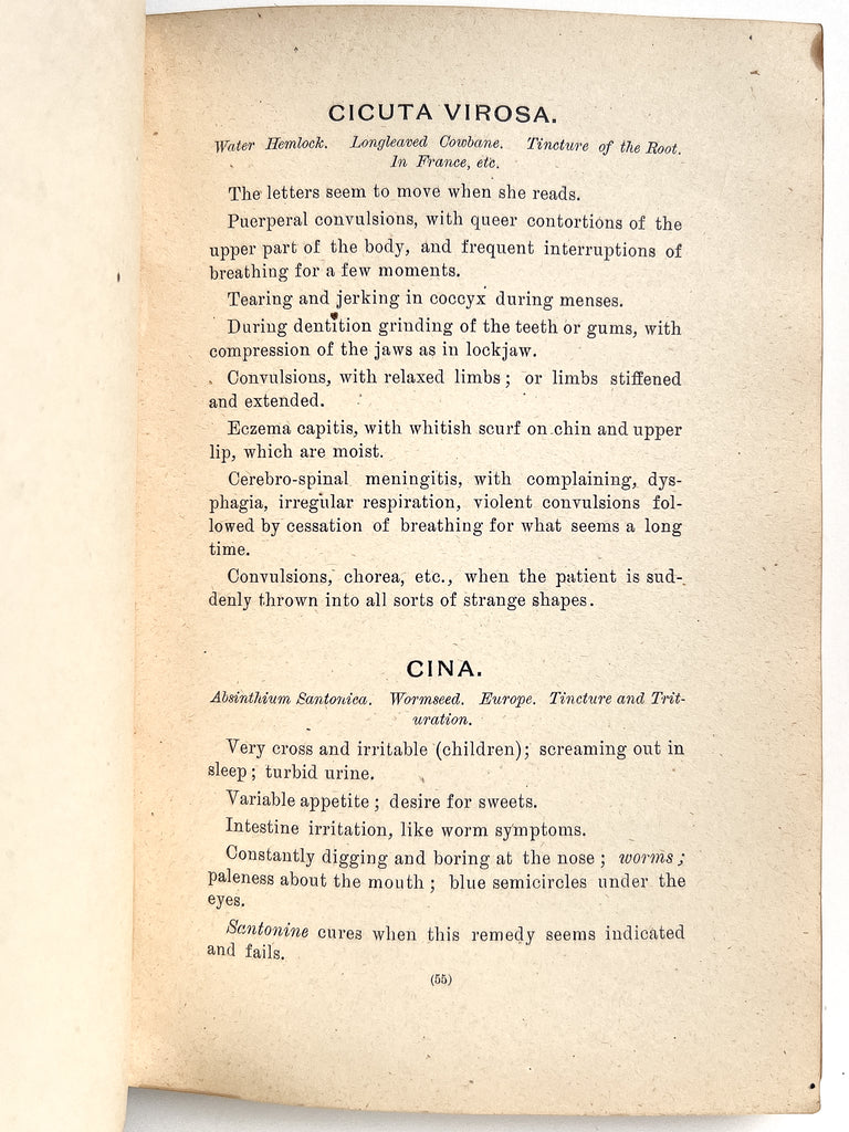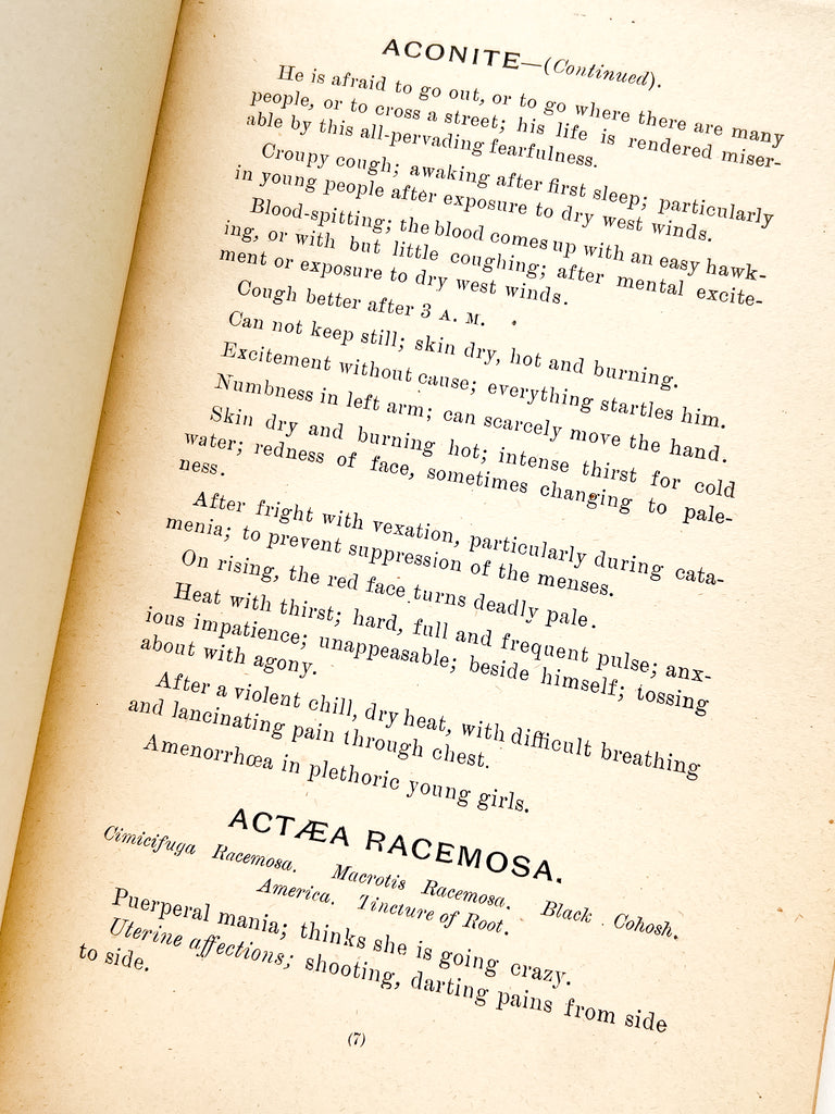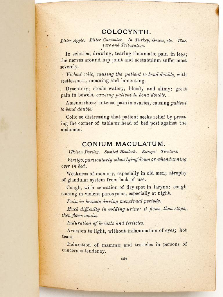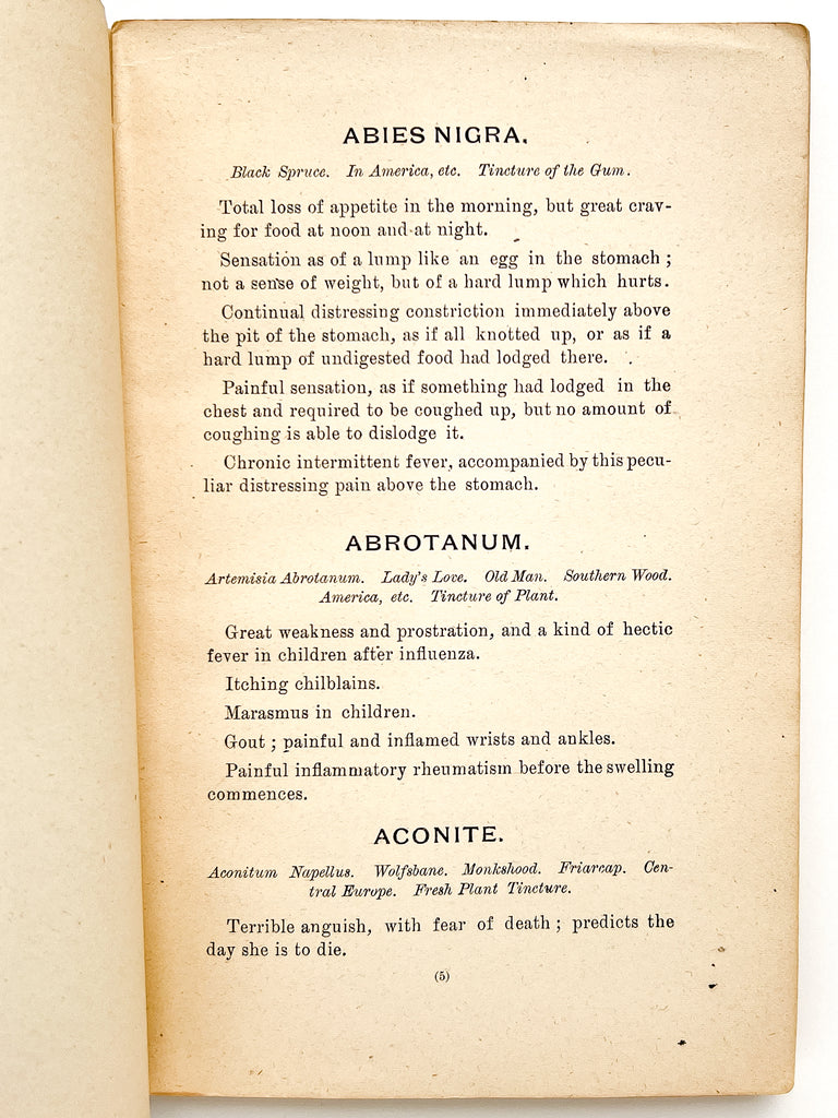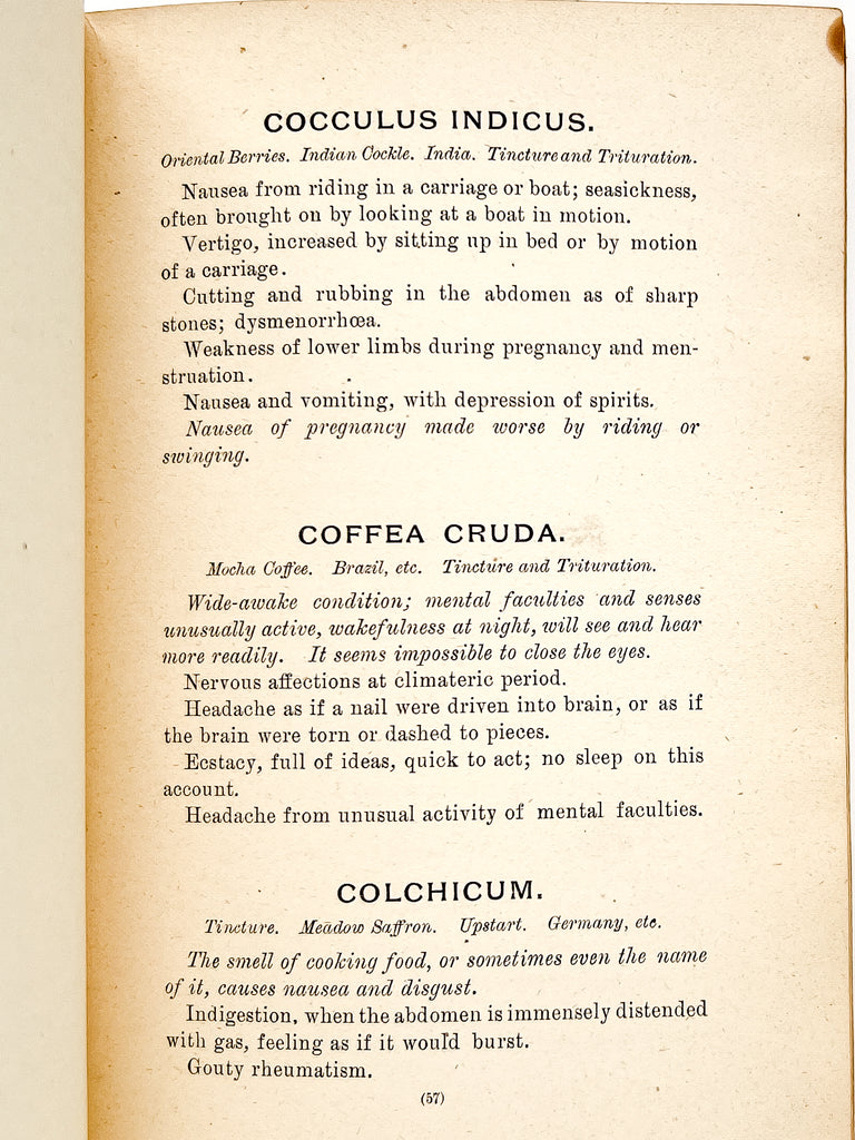 Identifies "key-note" symptoms matched with various substances--a straightforward premise, written "in the language of the authors from whose works they have been selected" (3), resulting in odd and inconsistent phrasing. Some entries reflect objective medical terminology and symptom documentation, others are more of anecdotes and opinions, and some offer all of the above. Caulophyllum is indicated for a variety of pregnancy complications (49) and Chamomilla for "Over-sensitiveness after coffee or opium" (52). Aconite lists, "He is afraid to go out, or to go where there are many people, or to cross a street; his life is rendered miserable..." (7) Under Rhododendron, he says, "All evil results from menses becoming irregular from getting feet wet" (107). An interesting glimpse at how medical information was recorded and interpreted, and fun to read as experimental literature.