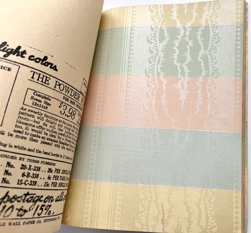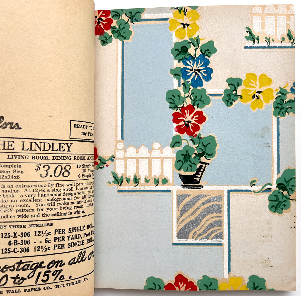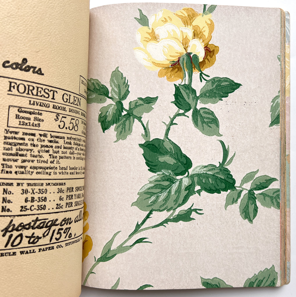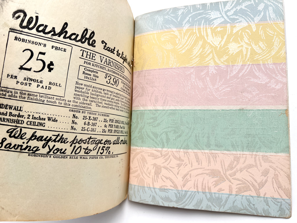 Quarto in color printed wraps. (4)p text followed by 68 full leaves of wallpaper samples. Heavy soil and wear to wraps, including losses at both spine ends. Despite exterior wear, contents are generally bright and fresh with occasional closed tears at the edgess from hasty turning. Great patterns, from classic designs to "conversation" patterns, various textures and finishes.