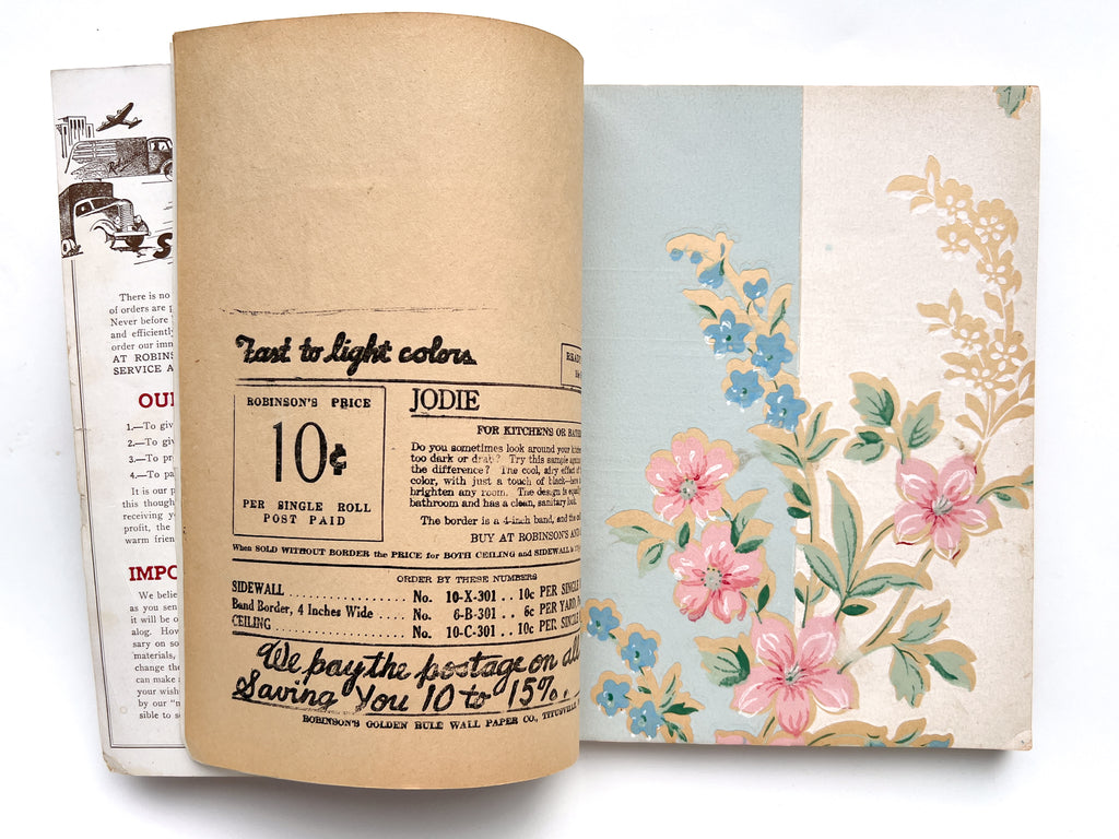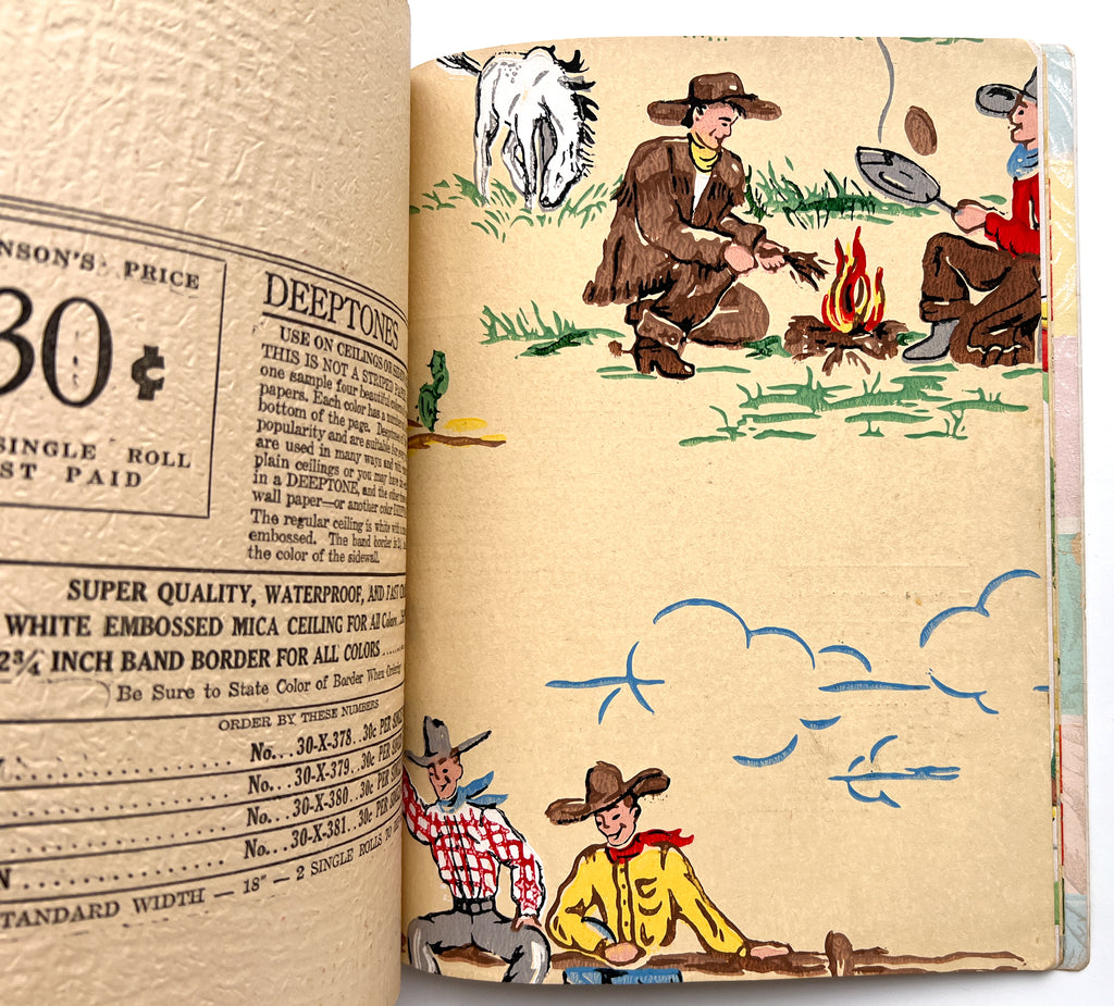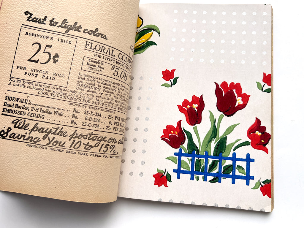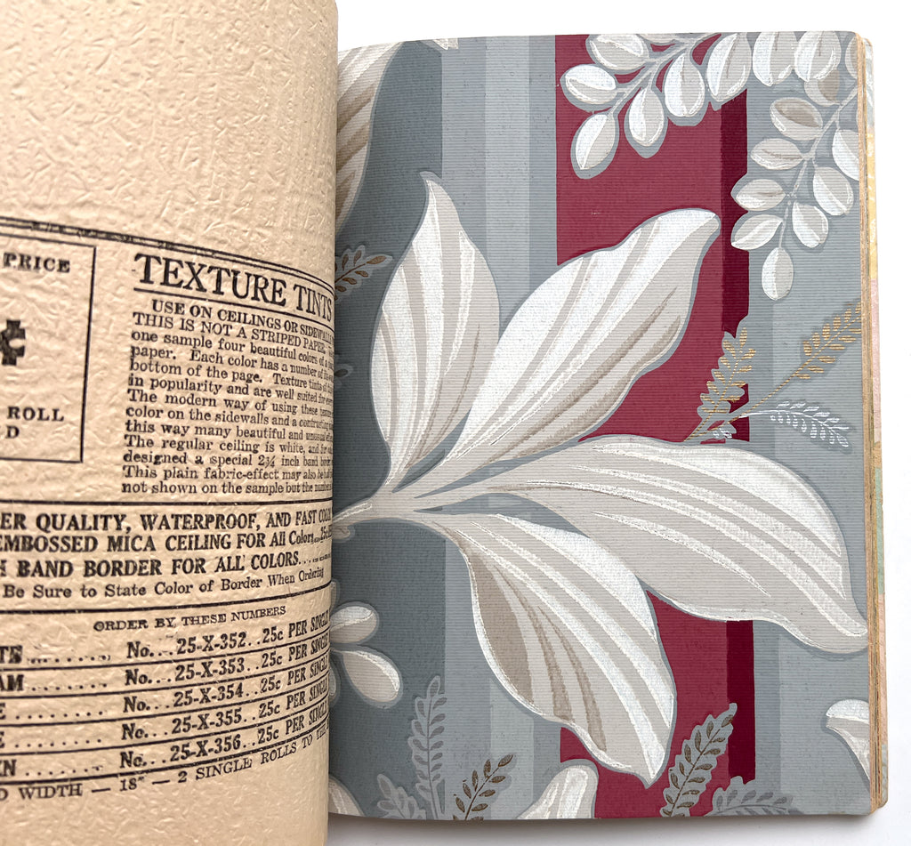 Quarto in color printed wraps. (4)p text followed by 68 full leaves of wallpaper samples. Heavy soil and wear to wraps, including losses at both spine ends. Despite exterior wear, contents are generally bright and fresh with occasional closed tears at the edgess from hasty turning. Great patterns, from classic designs to "conversation" patterns, various textures and finishes.
