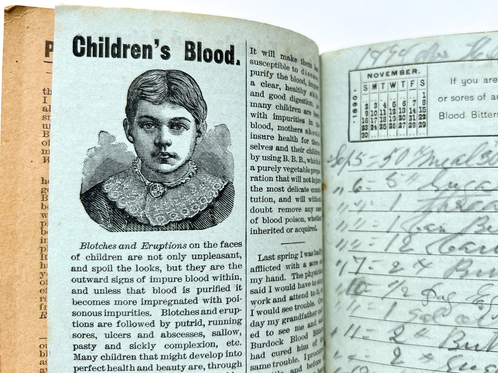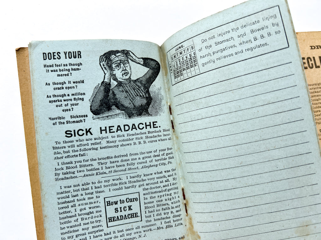 With some great in-text illustration. Wallet style heavy card wraps with contents printed on blue paper stock. (28) pages, 12 designated for notes with monthly calendar headings running November 1890-October 1891. First 4 memo pages and the designated wrapper page have pencil notes; closed split along the lower right fold. This copy stamped by local supplier F. Sponable, Laselville, NY.