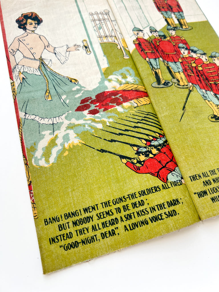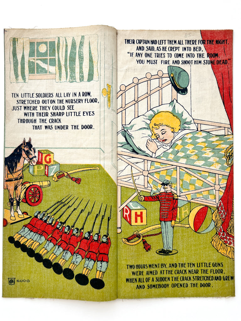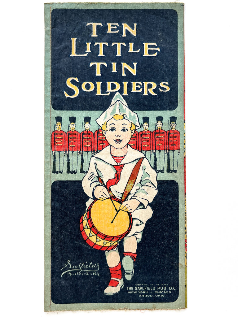 6 unnumbered pages, 13 x 6 inches. Near Fine, a crisp and bold copy with minor wear. The story of a boy who tells his tin soldiers to shoot any intruders when he goes to bed, so they shoot his mother when she opens the door--luckily, their guns were too small to harm her. A weird story to consider in the modern climate of gun violence and childhood mortality from firearms. Also, an uncommonly nice cloth book example.