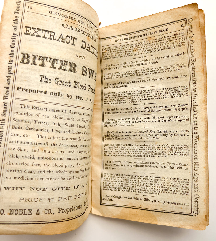 Printed by Ashby & Vincent, Erie, PA. Purple printed wraps, 12mo, 32pp. Ad on last page for Alps Insurance Company dated 1873. Sunning around the edges of the pleasingly purple wraps, shallow chipping to the fore- and bottom edges, waviness to textblock, else Very Good (if Very Fragile). A booklet promoting Dr. Jno. S. Carter's Family Medicines, particularly Carter's Compound Extract of Smart Weed, offering recipes for cooking, dyeing, washing hair brushes, estimating the amount of hay in a mow, etc. "Carter's Female Restorative" is recommended for "Weakly wives, mothers and daughters," and between their periods. The content is formatted so that each recipe alternates with a promotional message, making it impossible to use the reference without absorbing the advertising--"For suppression or painful Menses, Carter's Extract of Smart Weed is Nature's own medicine" and "Remember parents, the Balm of Gilead is an excellent remedy for the Whooping Cough." A smart tactic, if unsettling, to have a recipe for currant jam bookended with a note about suppressing Menstruation.