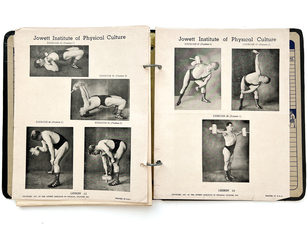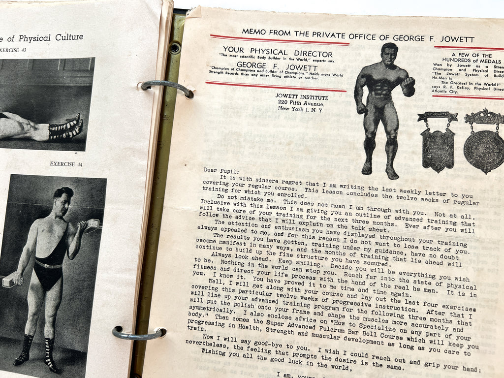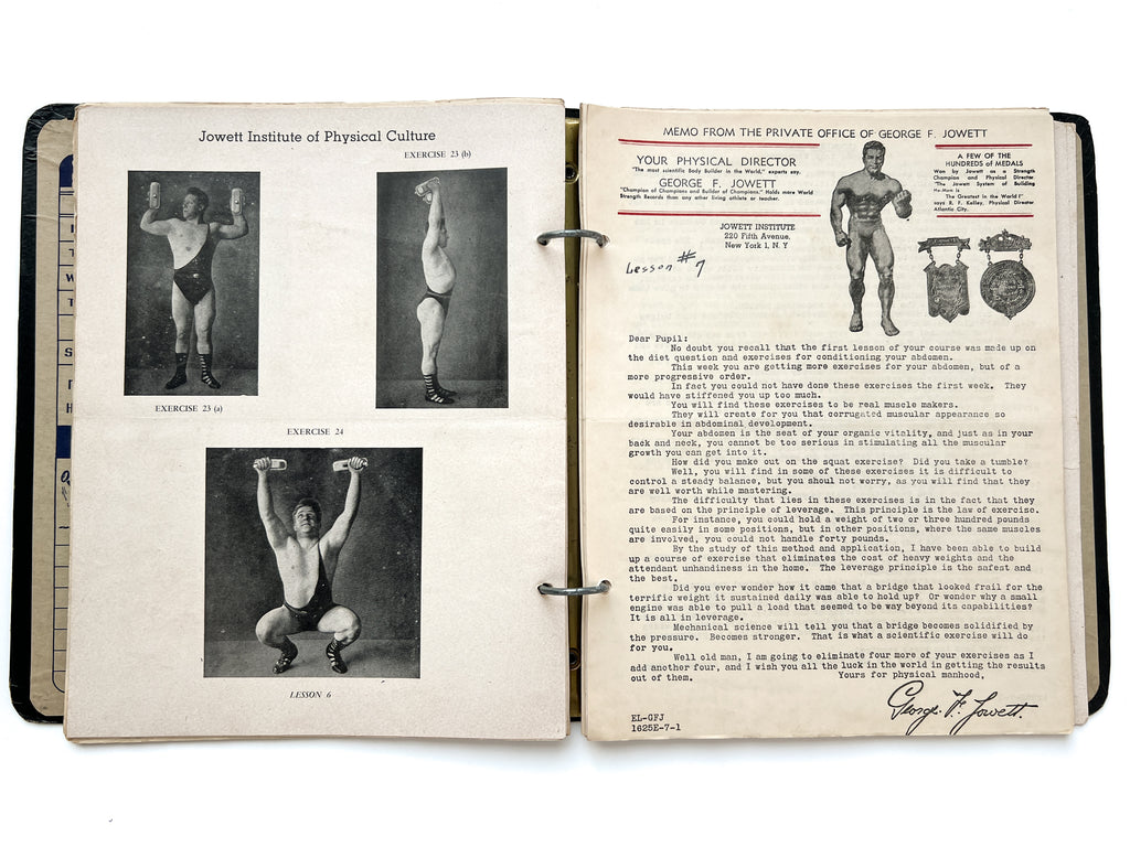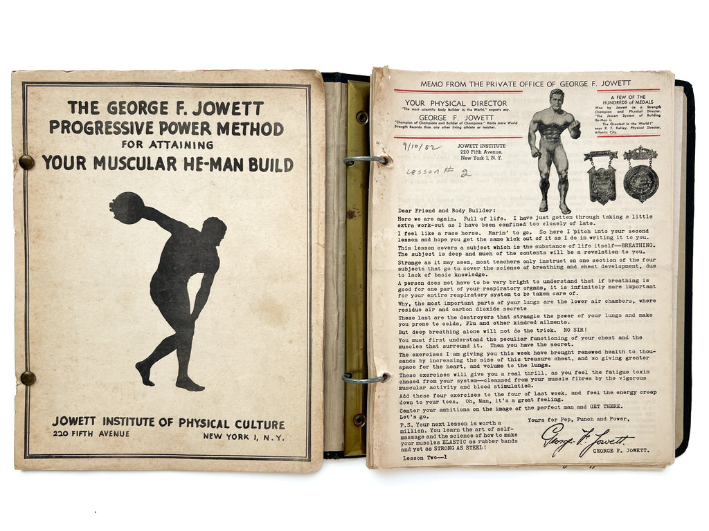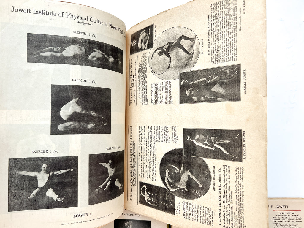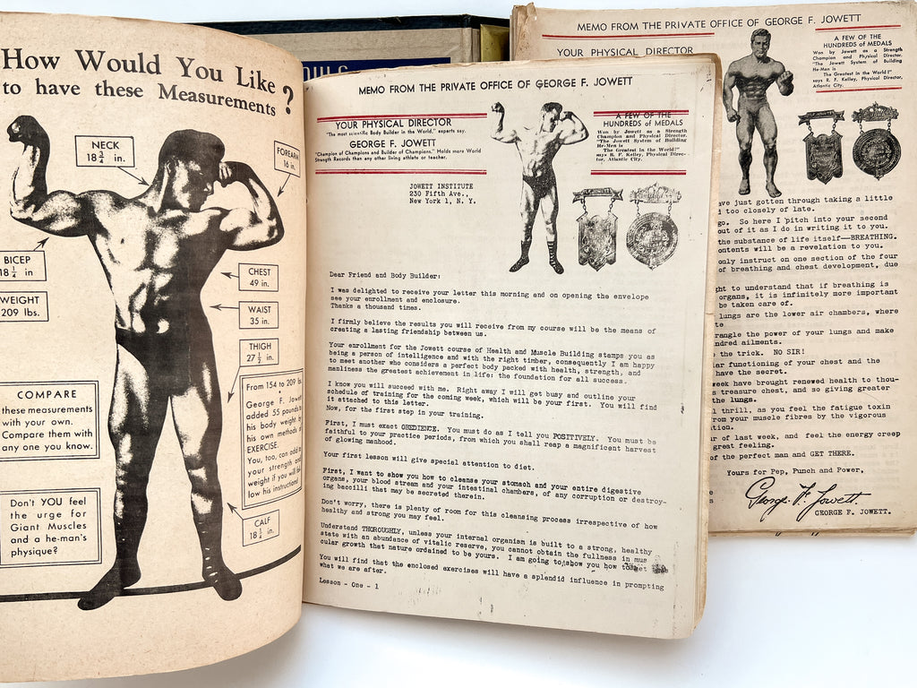 George F. Jowett was one of the first to apply the correspondence course method of education to physical training. He adopted a personal tone that made the learner feel like part of the "club," a proven tactic for popular fitness guides to this day. "Dear Friend and Body Builder: Here we are again. Full of life. I have just gotten through taking a little extra work-out as I have been confined too closely of late... I feel like a race horse. Rarin' to go." An uncommon example of the complete correspondence course and with later materials reflecting the evolution of fitness as pop culture—consider the photographs illustrating exercises in the 1927 guide versus the glamorous booklets, and even the branding shift.