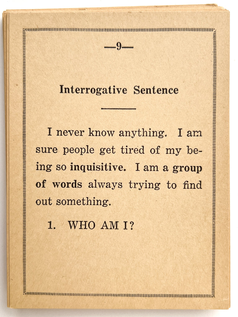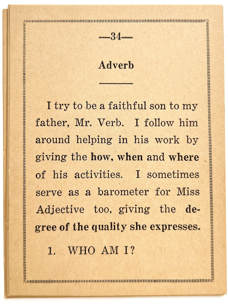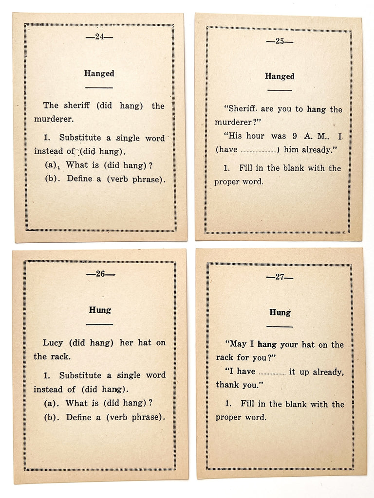 Better Speech (44+ cards) deals with usage issues like lie, lay, laid, lain and hanged/hung. Narrative examples for students that often reference family, sickness, work and money. The Practical Grammar Game (38+ cards)is more peculiar, essentially a series of riddles for parts of speech that contain an unexpected amount of psychological projection (see examples). They could send a teacher into an existential mire—particularly one who might, too, feel like “a group of words always trying to find out something.”