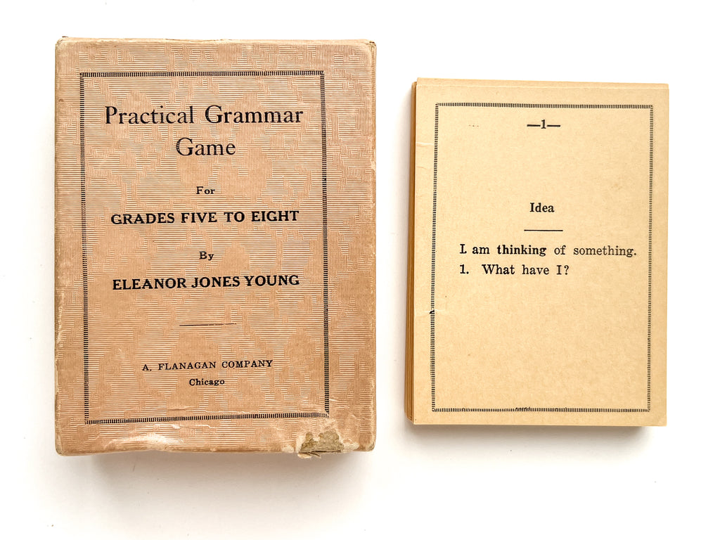 Practical Grammar Game for Grades Five to Eight. Chicago: A. Flanagan Co., (1925). Decorative paper-covered box, 4.25 x 3.25 inches. Dent and abrasion to the bottom edge of the lid, puncture to the bottom of the base which has a printed ad for H. B. Rogers Geography Game. Contents clean and crisp, VG+ overall. Complete with 38 numbered game cards, 1 title and 3 instruction cards. Noted in the Journal of Educational Research with 1925 copyright under E. J. Young (Vol. 13, No.1, Jan 1926). Not in OCLC. Slightly oversize and more decorative box than our copy of Better Speech. Not sourced together.