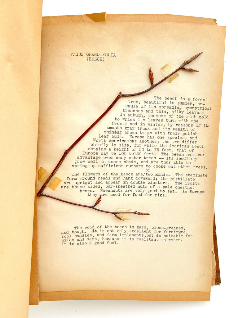 Wonderful and unwieldy, an exciting variation on the herbariums and botany specimen books popular in schools at the turn of the century. Though the specific school is unidentified, the item comes from northern Indiana and was likely coursework from one of the trade schools in the region (or a specialized school like Manual Arts High in Indianapolis).