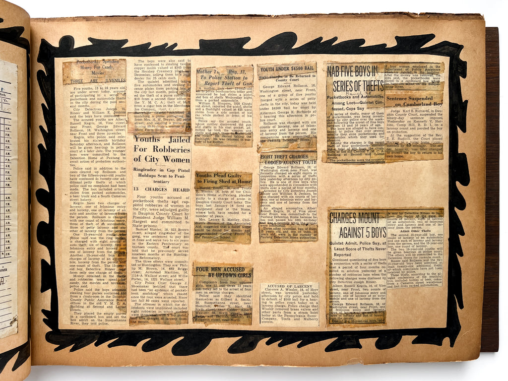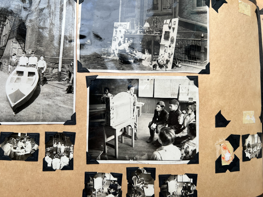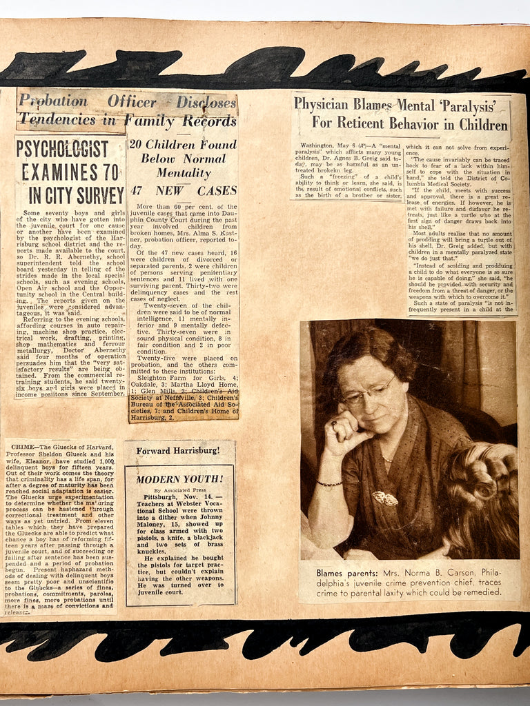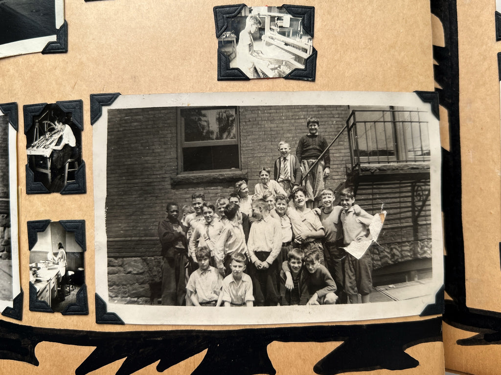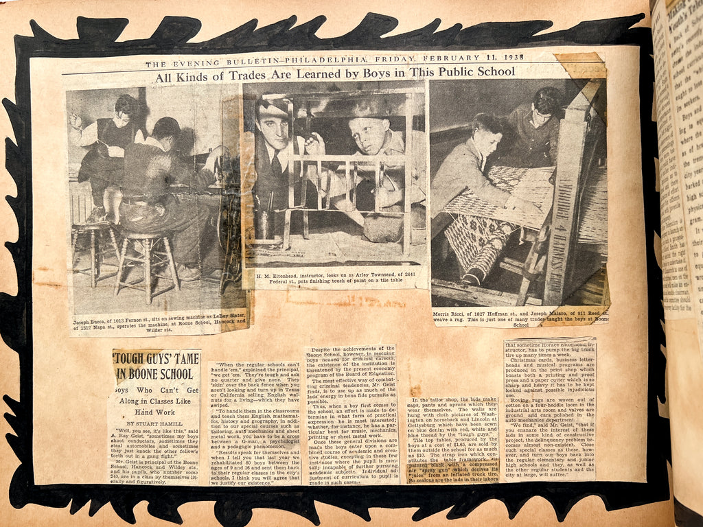 The album includes 95 original photographs showing students in the classroom, at the workbench, and showing off their wares. Younger students are also seen on field trips, playing baseball, and exploring public spaces. Goofy and characterful, they give a face to the “criminal youth” represented in ~40 newspaper clippings about various persons related to the school. Dating up to 1948, many document student outcomes that are not always, or even often, positive. Among regular reports of theft and arson are outliers: one boy becomes a war hero, another is sentenced to the electric chair.