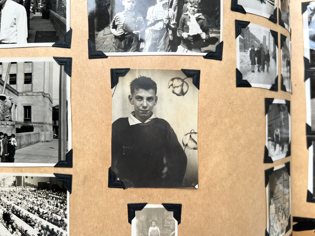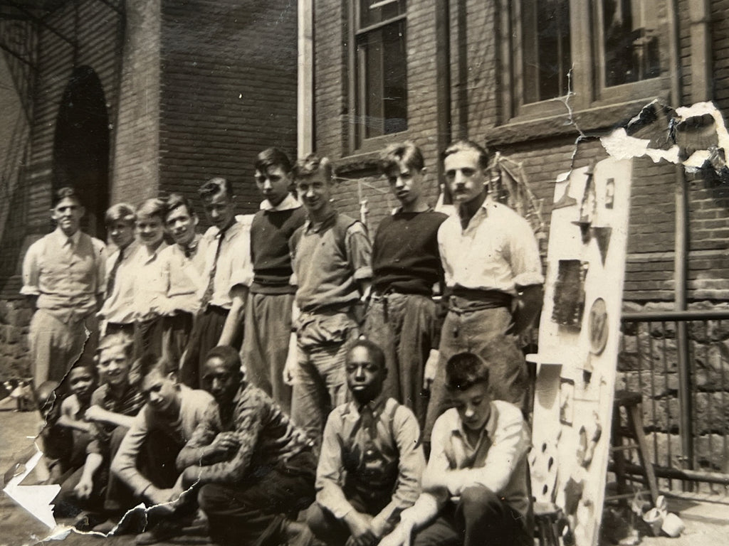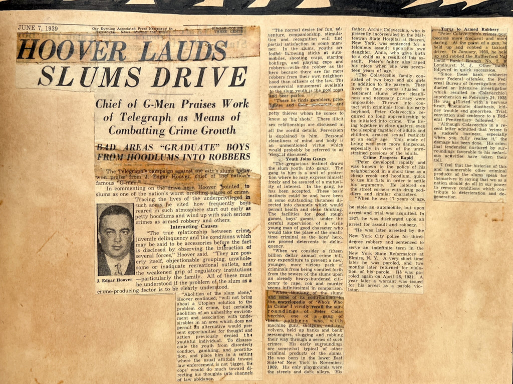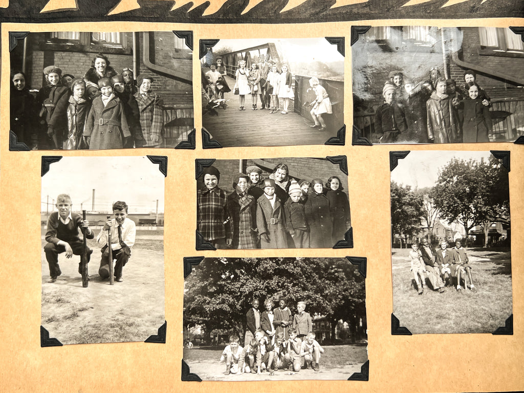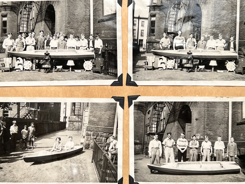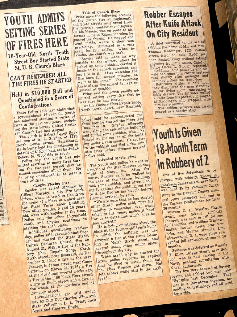The album includes 95 original photographs showing students in the classroom, at the workbench, and showing off their wares. Younger students are also seen on field trips, playing baseball, and exploring public spaces. Goofy and characterful, they give a face to the “criminal youth” represented in ~40 newspaper clippings about various persons related to the school. Dating up to 1948, many document student outcomes that are not always, or even often, positive. Among regular reports of theft and arson are outliers: one boy becomes a war hero, another is sentenced to the electric chair.