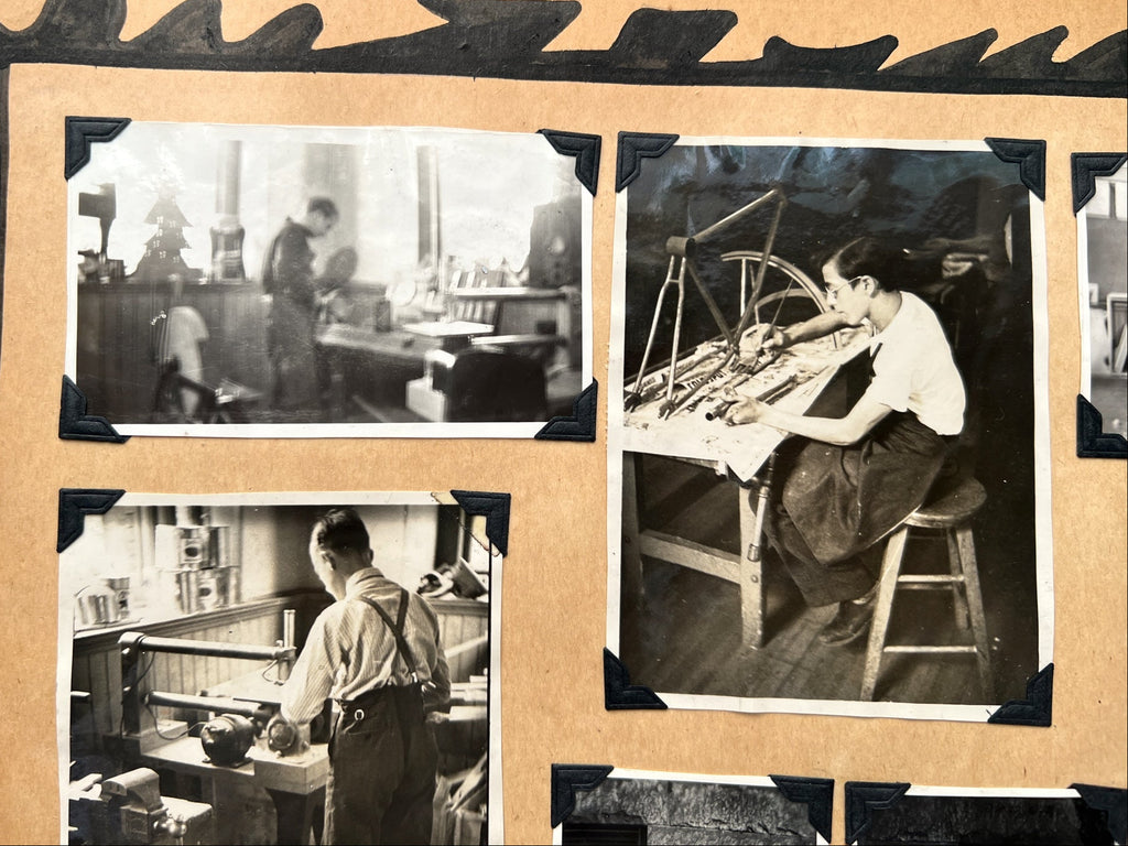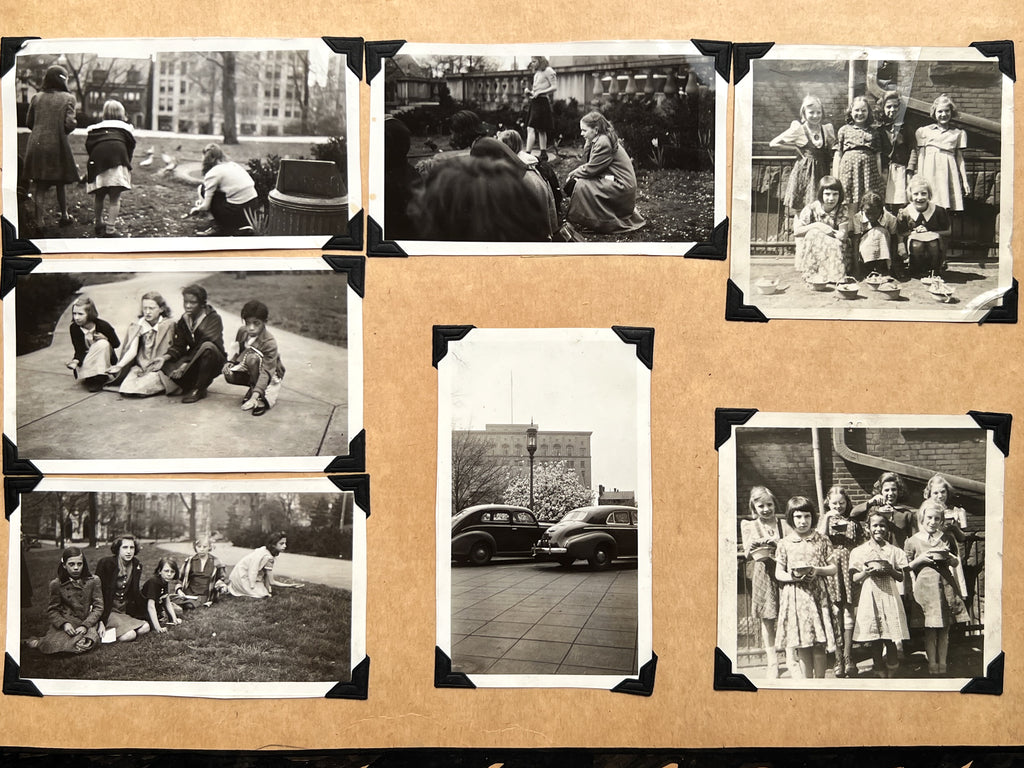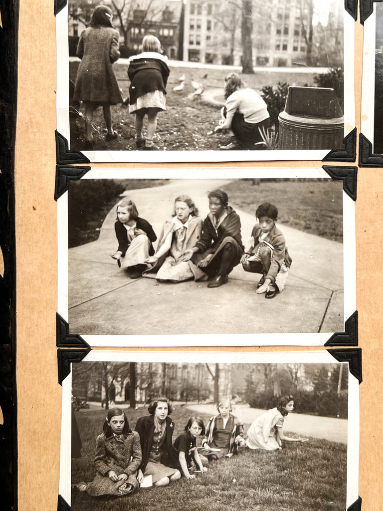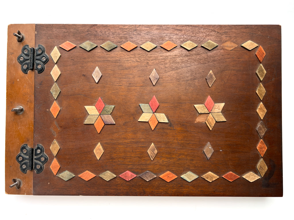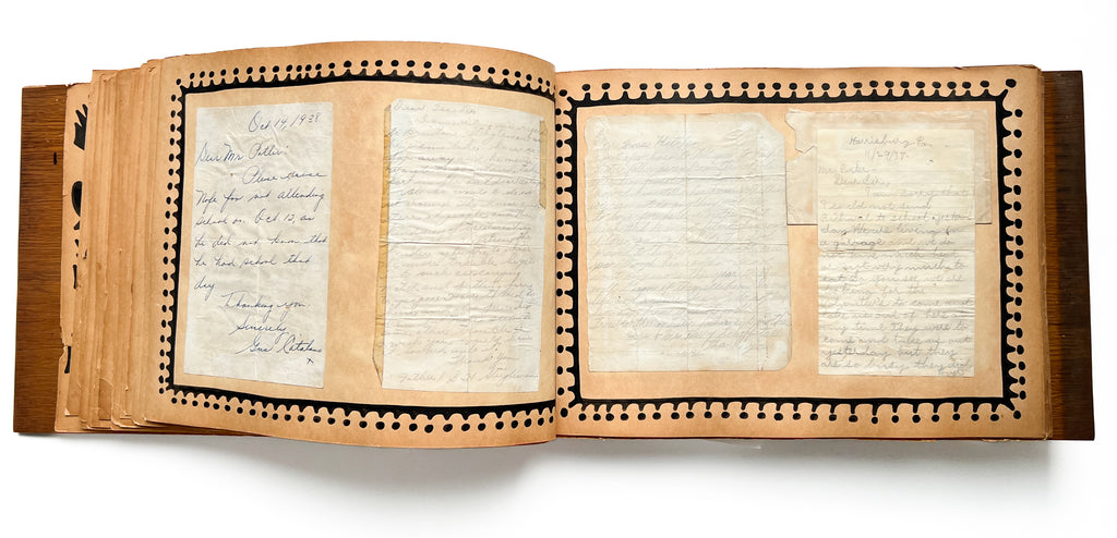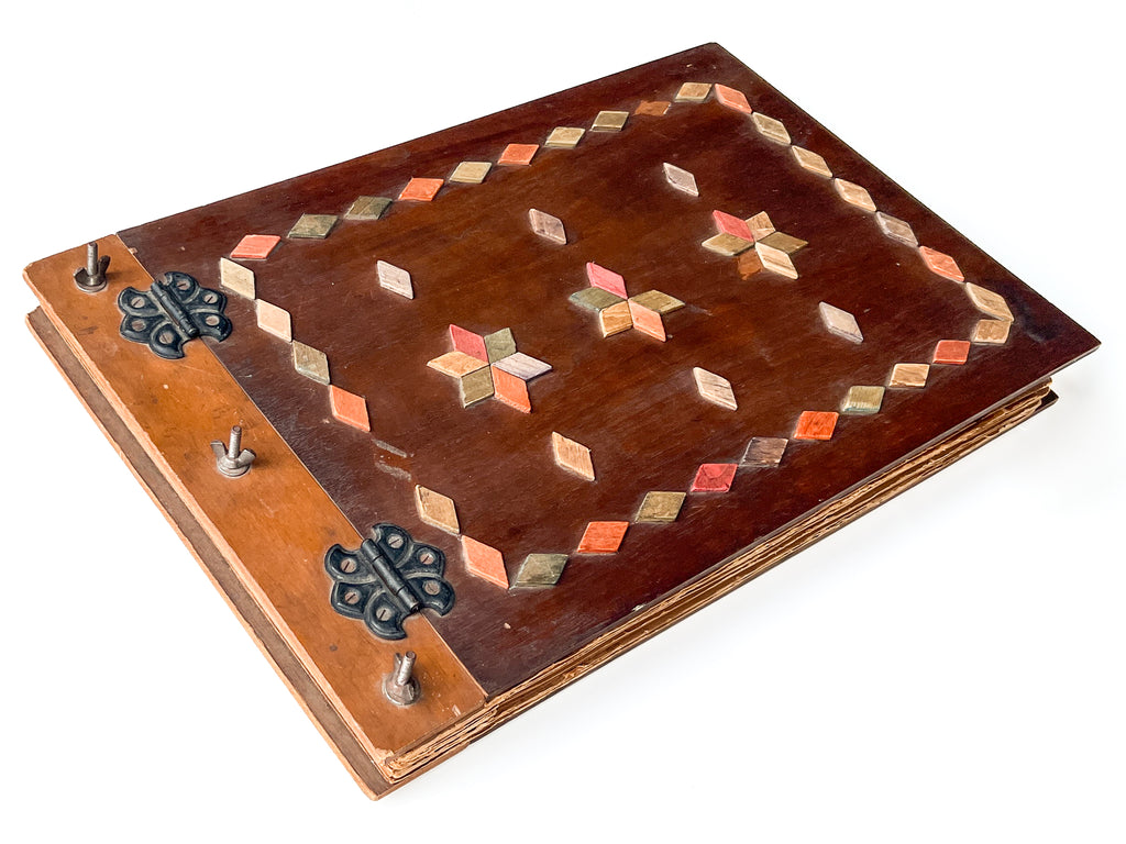 Wooden boards, 12 x 19.5 inches, (80) pages. In the kind of album students would make at the school: cover with onlaid parquetry design and decorative hinges; heavy paper stock with a decorative border drawn around each page, and some creative solutions for mounting multi-page documents. Very Good with occasional chipping and edgewear to the toned leaves, one lined with tape along the bottom. Occasional abrasion and a few photos with edge tears, taped news clippings, one torn with loss. Lacking 4 of the mounted parquetry diamonds, some dulling to boards. Quirky and unwieldy, but retaining nearly all its original content.