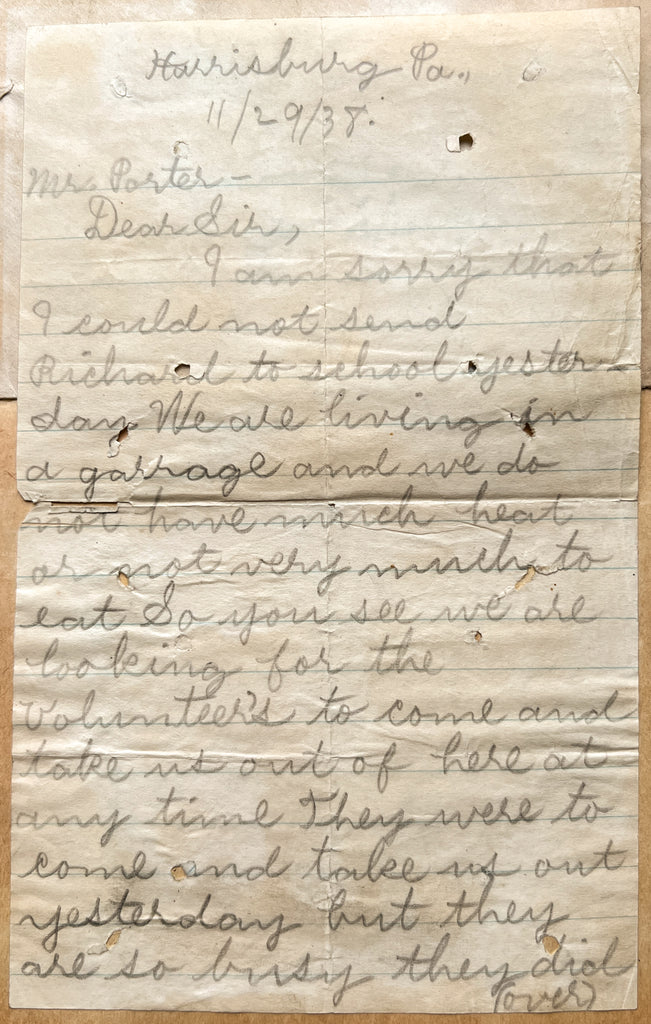 Written from 1937 to 1944, food and housing insecurity are primary issues demonstrated in the 50+ notes from parents. Full of irregular spelling and penmanship, some written on the backs of envelopes and other scraps—they capture the voices of people who are often recorded only as statistics relating to race, poverty, incarceration, single-parent and housing status. (1) Among their messages are requests to help get shoes, haircuts, check for lice, and an overwhelming demand for school lunch, with multiple examples of parents forced to choose between affording rent and feeding their children. Excuses for student absences are humorous and heartbreaking in turn. One boy “had too much parade,” another “didn’t know he had school.” A poignant note from 1938 explains, “We are living in a garrage and we do not have much heat or not very much to eat, so you see we are looking for the volunteers to come and take us out of here at any time…”