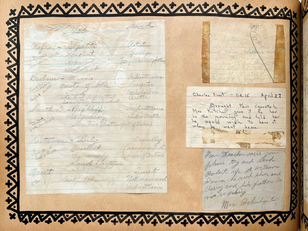 Aggression on school grounds is documented in notes like “[—] told me to stick the book up my ass,” and complaints from parents, including “John is coming home & saying that the boys in his work bench doing dirty things showing him his worm & telling him to suck it,” and “Will you please stop those fat kids from hitting Shirley every time she comes out of school.” Teachers share the frustration, too. One asks Porter: “She told me to go to Hell… is sitting like a mule refusing to do anything… Any suggestions?”