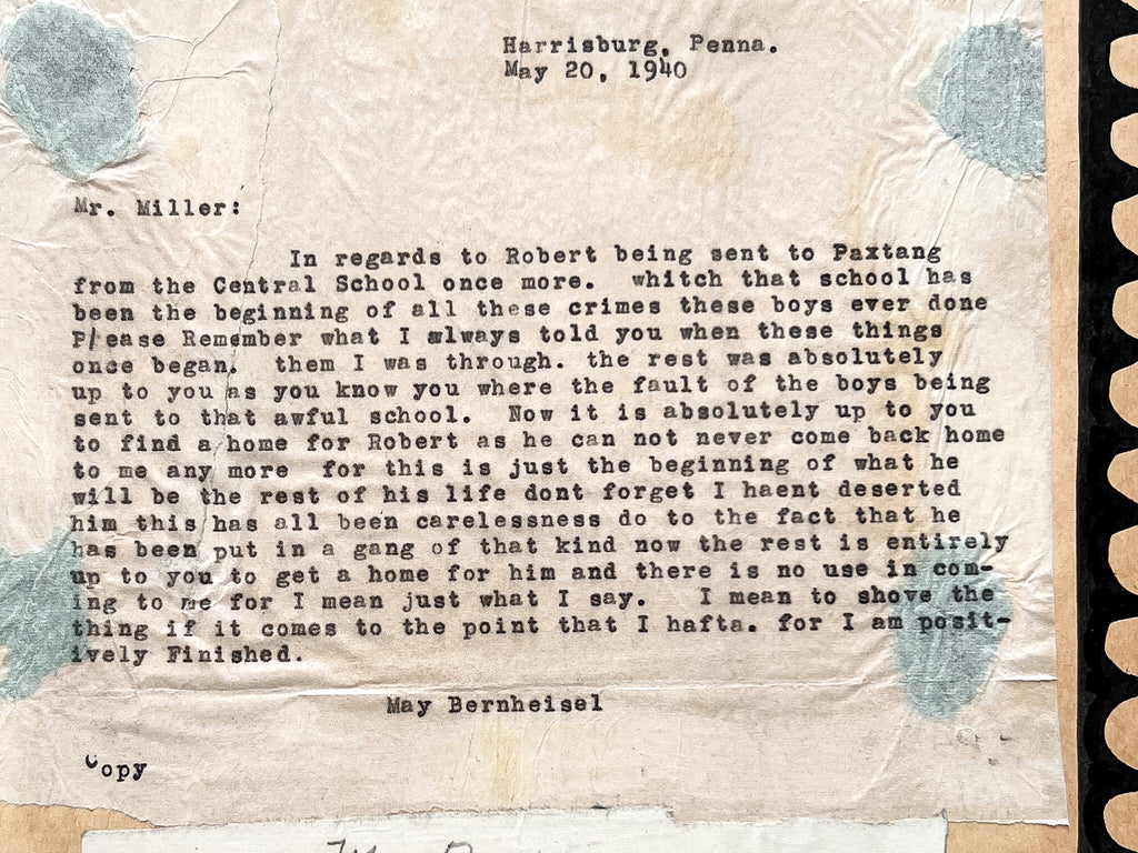 In regards to Robert being sent to Paxtang from the Central School once more… that school has been the beginning of all these crimes these boys ever done. Please Remember what I always told you when these things once began. Then I was through. the rest was absolutely up to you as you know you where the fault of the boys being sent to that awful school. Now it is absolutely up to you to find a home for Robert as he can not never come back home to me any more for this is just the beginning of what he will be the rest of his life dont forget I haent (sic) deserted him this has all been carelessness do to the fact that he has been put in a gang of that kind now the rest is entirely up to you to get a home for him and there is no use in coming to me for I mean just what I say. I mean to shove the thing if it comes to the point that I hafta. For I am positively Finished.”