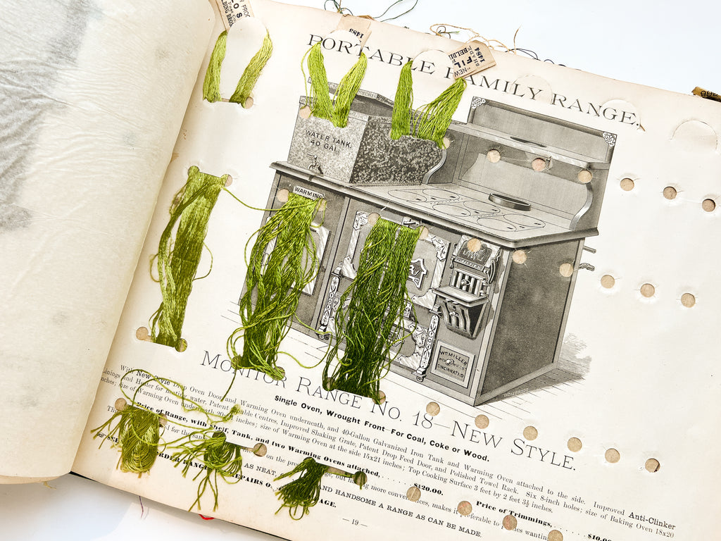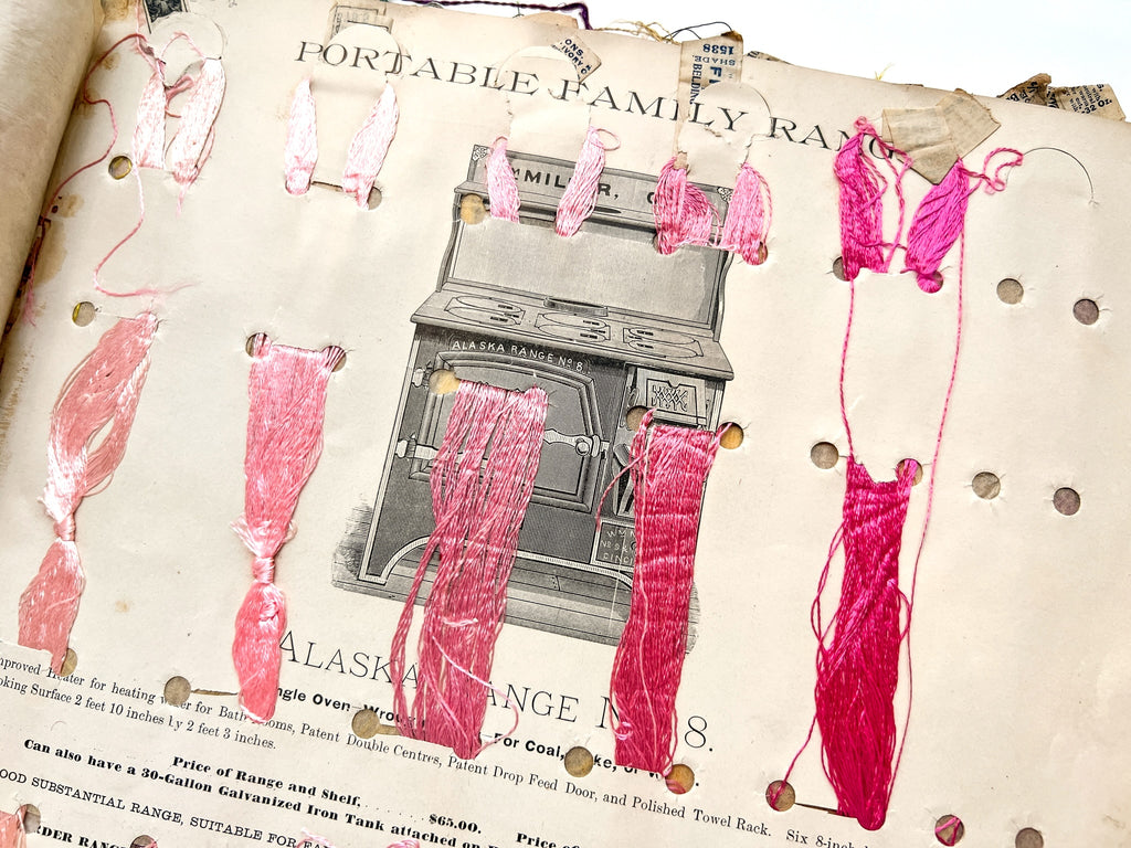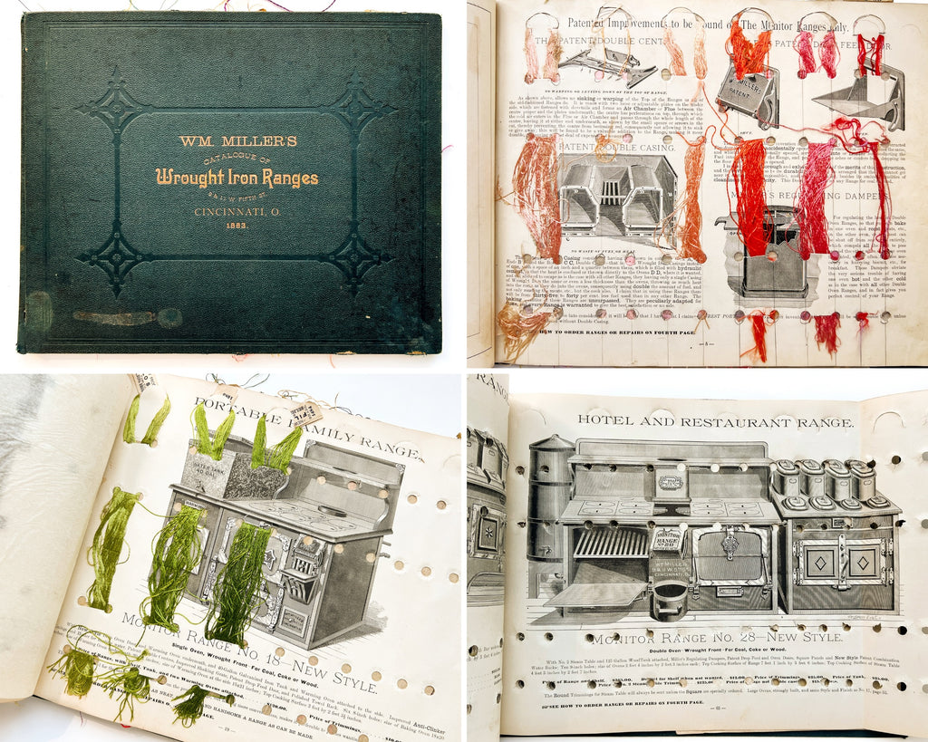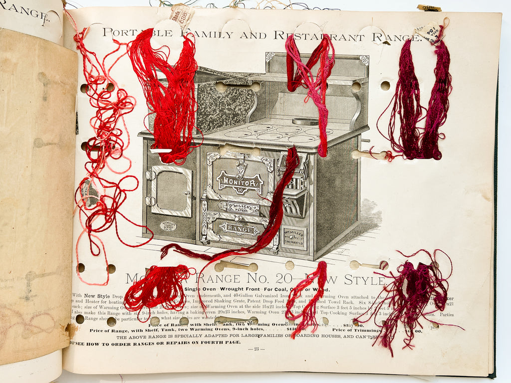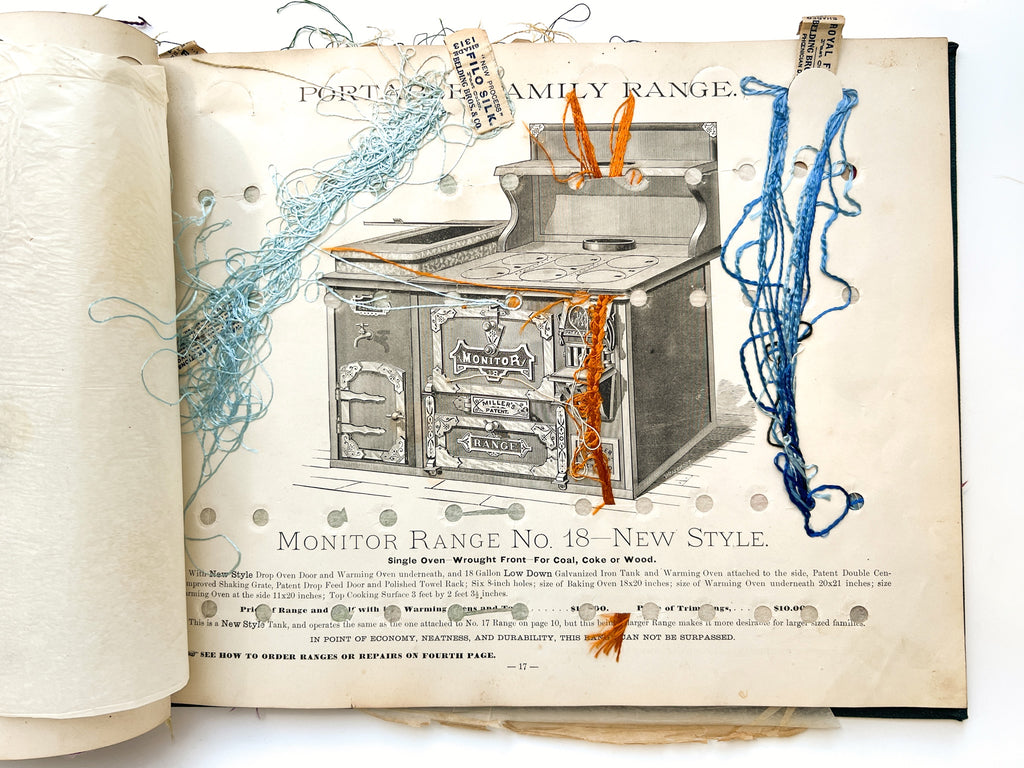 Technically a very damaged copy of a very rare trade catalog, but a wonderful example of an object’s lived experience (and the historical precursor of "I saw it on Pinterest" DIY projects). The reuse was likely done ca. 1900 based on the silks present, around the time a commercially made floss holder of the same design was being advertised in magazines. The stove catalog would have been obsolete by then, too, and its oversize interior seemed to offer a prime organizational opportunity. The first page shows how the holes were plotted out in pencil (just a little askew). Flosses are present for about half the book, with occasional tissues guards also tipped in.