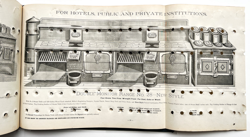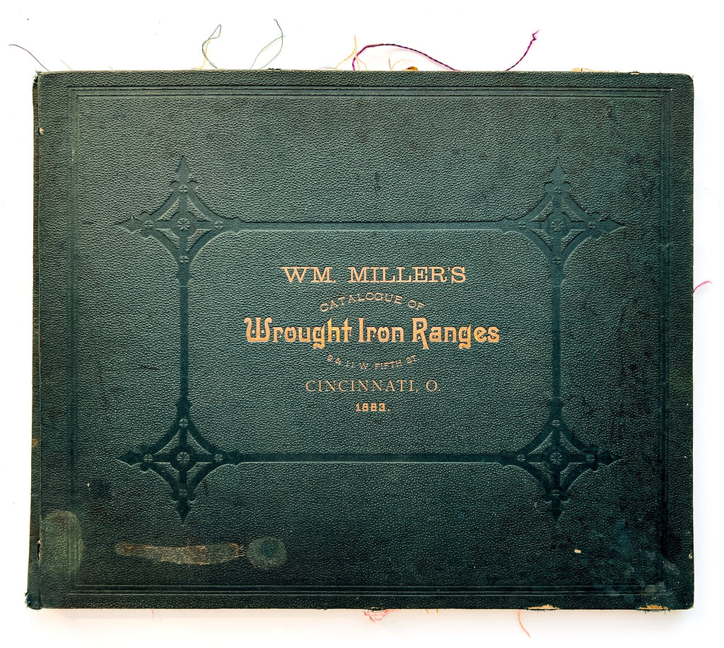 Wm. Miller’s Catalogue of Wrought Iron Ranges 9 & 11 W. 5th St, Cincinnati, O. 1883 (cover title). Printed by Sullivan & Co. Oblong cloth folio, 82pp. Illustrated on nearly every page, plus two folding plates for extra-long commercial models. Cracking to both hinges and 1" puncture toward the lower front joint and rubbing to edges with areas of boards exposed. Fingersoil and discoloration; all the holes.