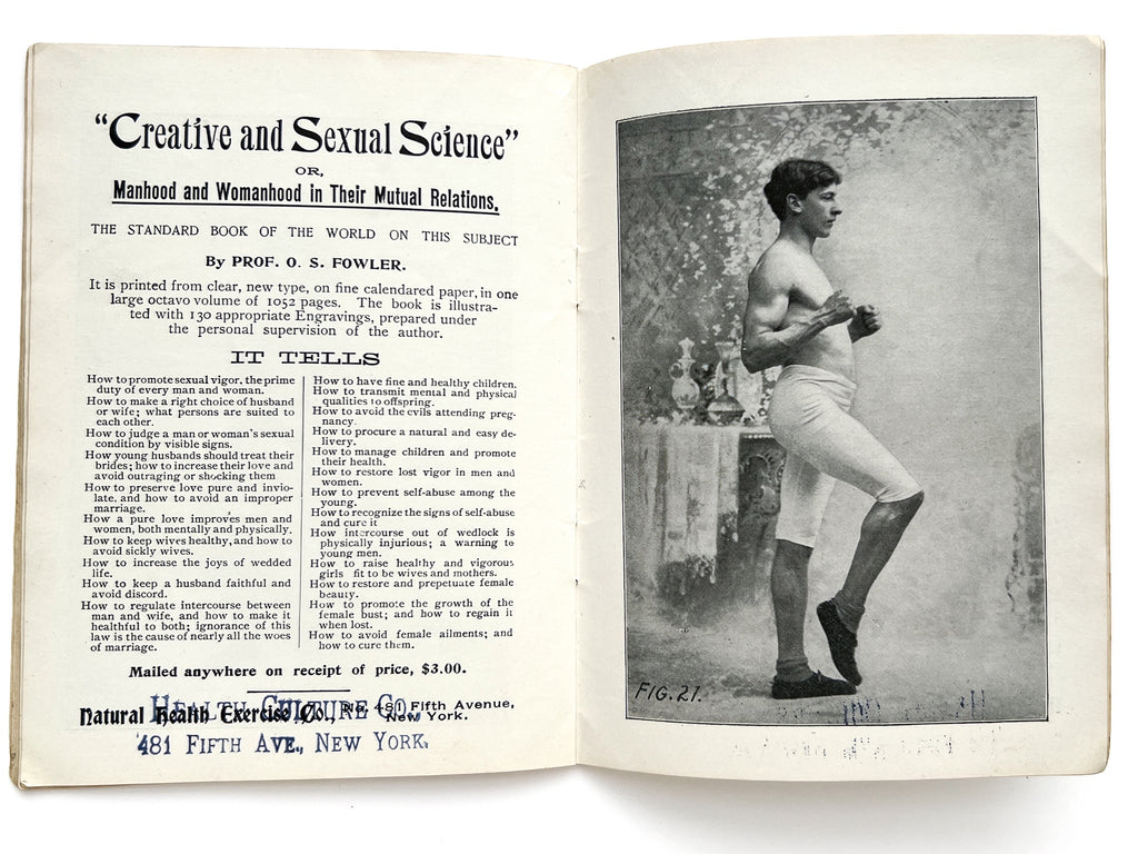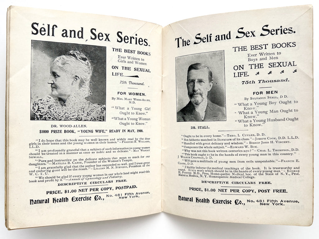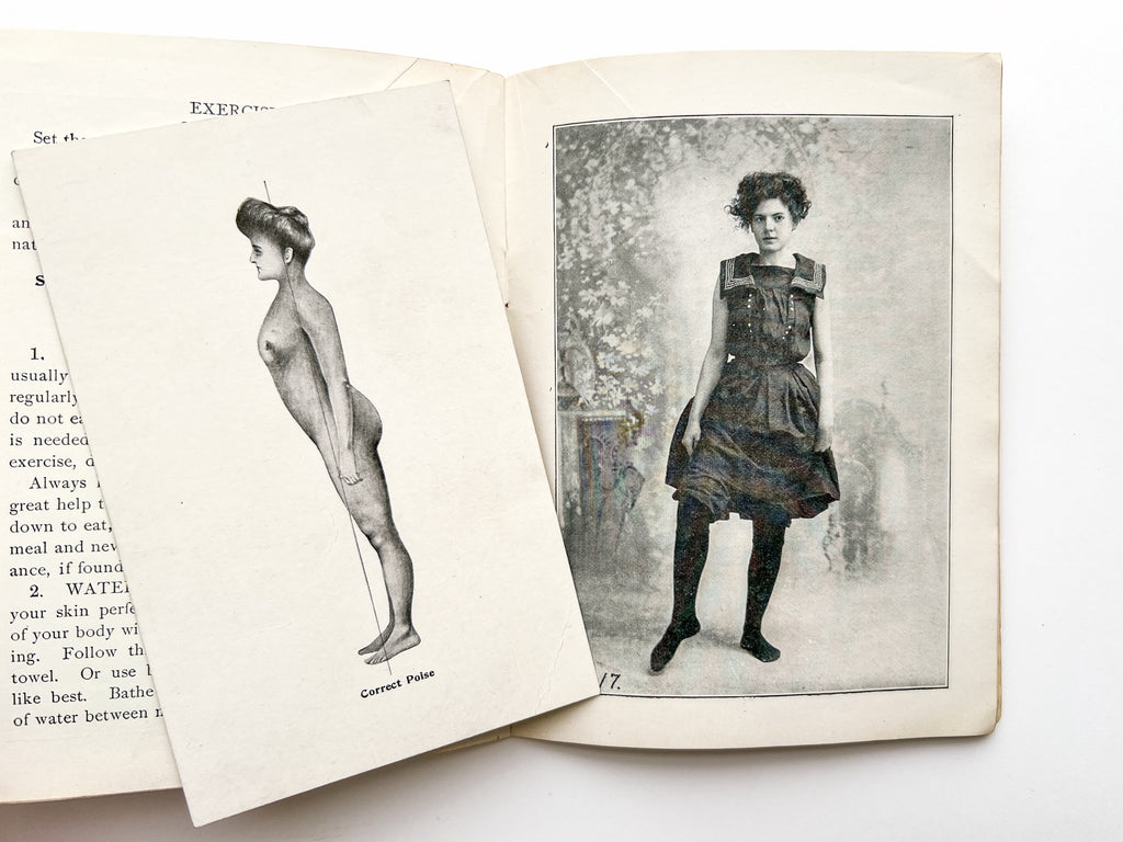 Stapled wraps, 6 x 4.5 inches, 40pp + (22) pages of additional photos and advertisements for health publications and accoutrements, much produced by the Natural Health Exercise Co and/or relating to sexual health. Very Good with light soil and creasing to wraps, small chip to the rear wrap at the heel of the spine, contents clean and crisp. "Health Culture Co." stamped over the imprint. Stated 30th thousand, but a very rare survival. OCLC records 1 copy at the New York Historical Society Library. With a helpful double-sided "poise" card laid in, showing in/correct ladies' posture.