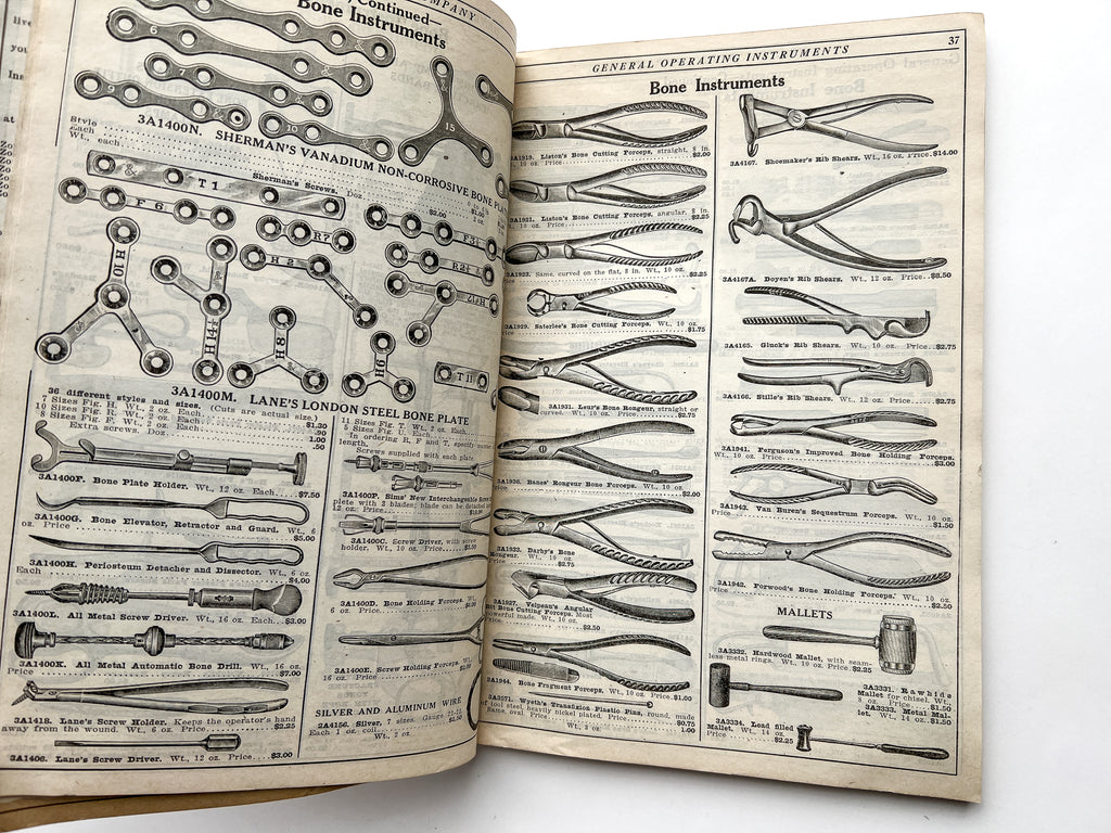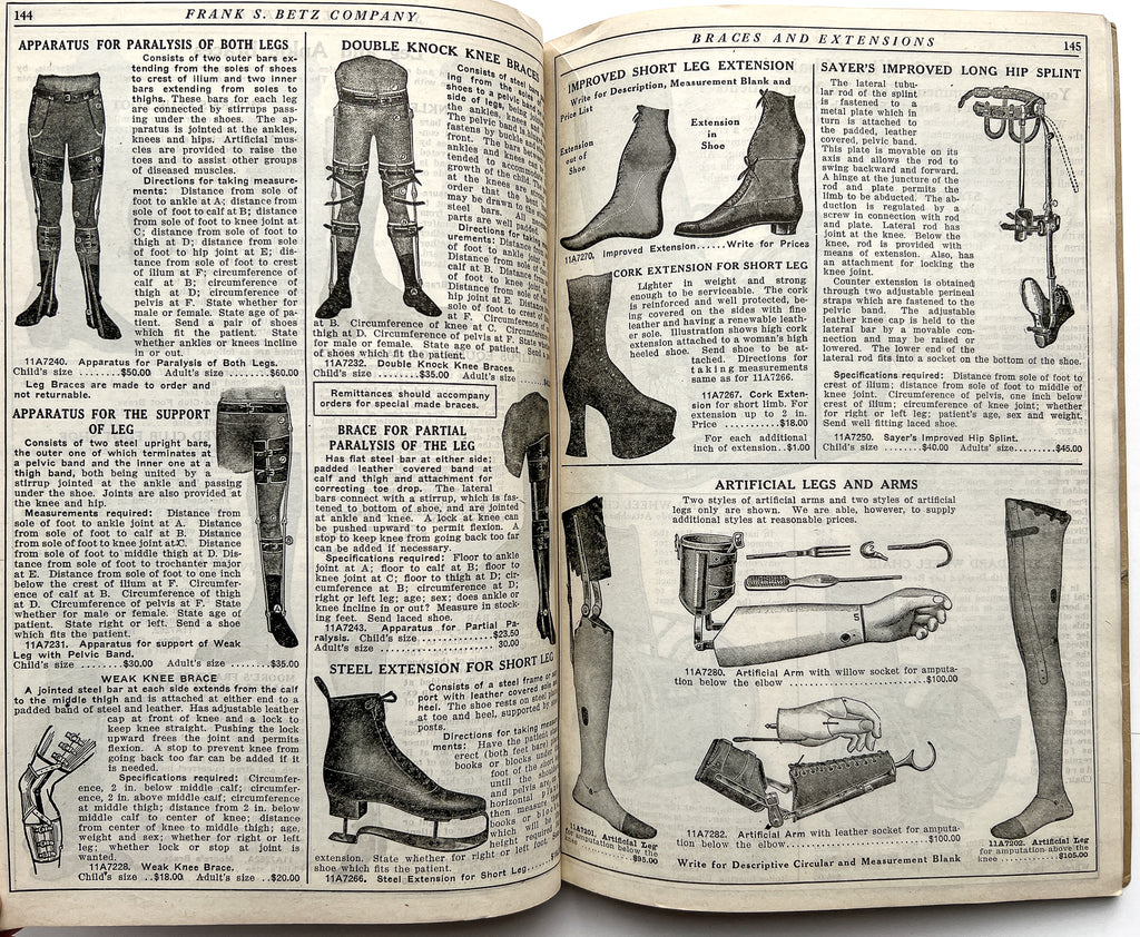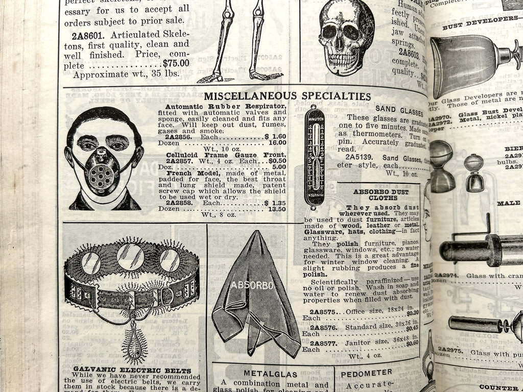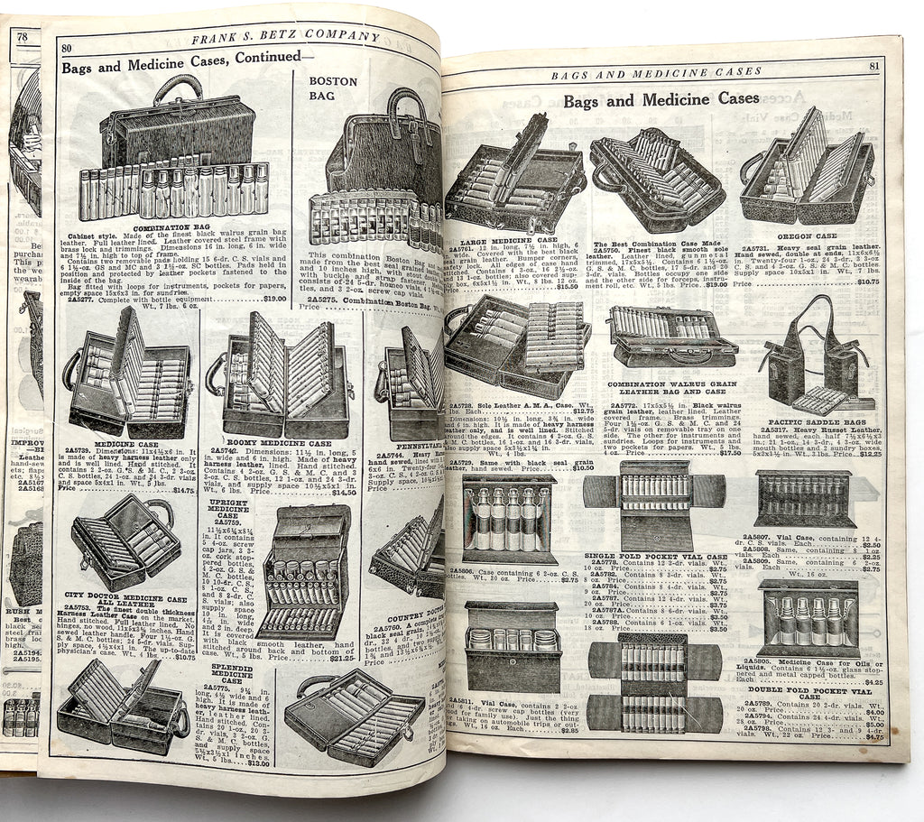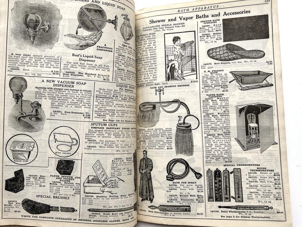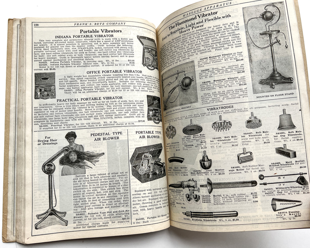 The range of offerings show anything and everything involved with running a medical practice, from slippers and gowns to cabinetry, exam tables, surgical instruments, wheelchairs, prosthetics, signage, etc. The women's health instruments are of note--portable and floor model vibrators with different attachments, a hair drying stand, a heating pad. Wonderfully illustrated and full of extras that make it feel like it was plucked right off a doctor's desk.