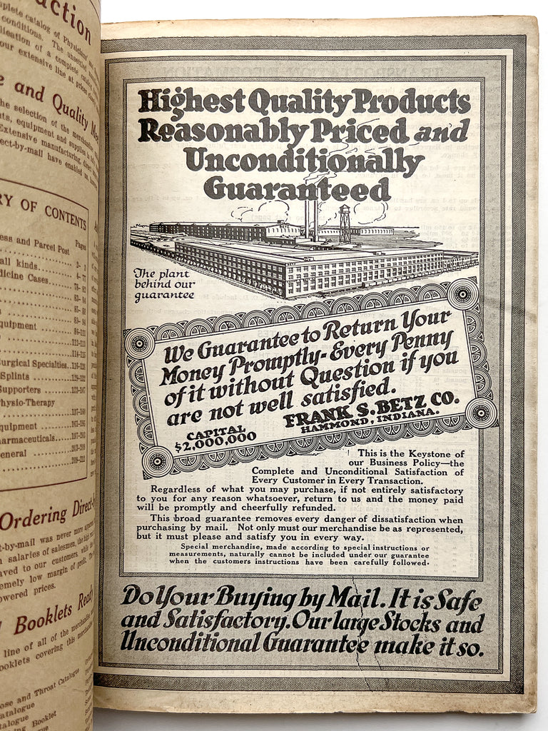 Spine title: Frank S. Betz Company Catalogue Number 22. Printed wraps, 4to, 212pp. Spine cocked, wrappers considerably soiled but contents remains clean and unmarked. A loaded copy of Betzco's 1922 catalog, which they note "marks the return to normal conditions," presumably referring to WWI manufacturing mandates.