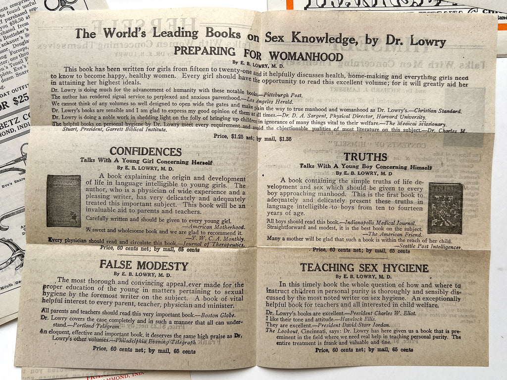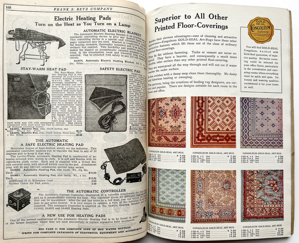 Profusely illustrated in black and white, with one color leaf advertising Congoleum floor coverings. A stash of additional circulars and related ephemera is laid in, including three nested (4p) inserts for the Betzoc Electric "Superior Electro-Therapeutic Cabinet," a laboratory kit and medical furniture set (with related order forms); printed circular for the "Greenwood Business and Tax Record" ledger book ("Suppose Uncle Sam's revenue man came to check up today...") and (4)p prospectus on E. B. Lowry's books on sex, Himself and Herself, are among the extras.