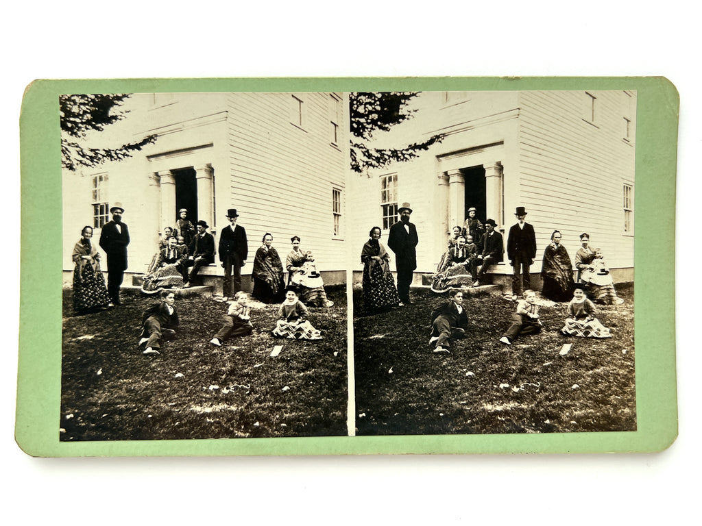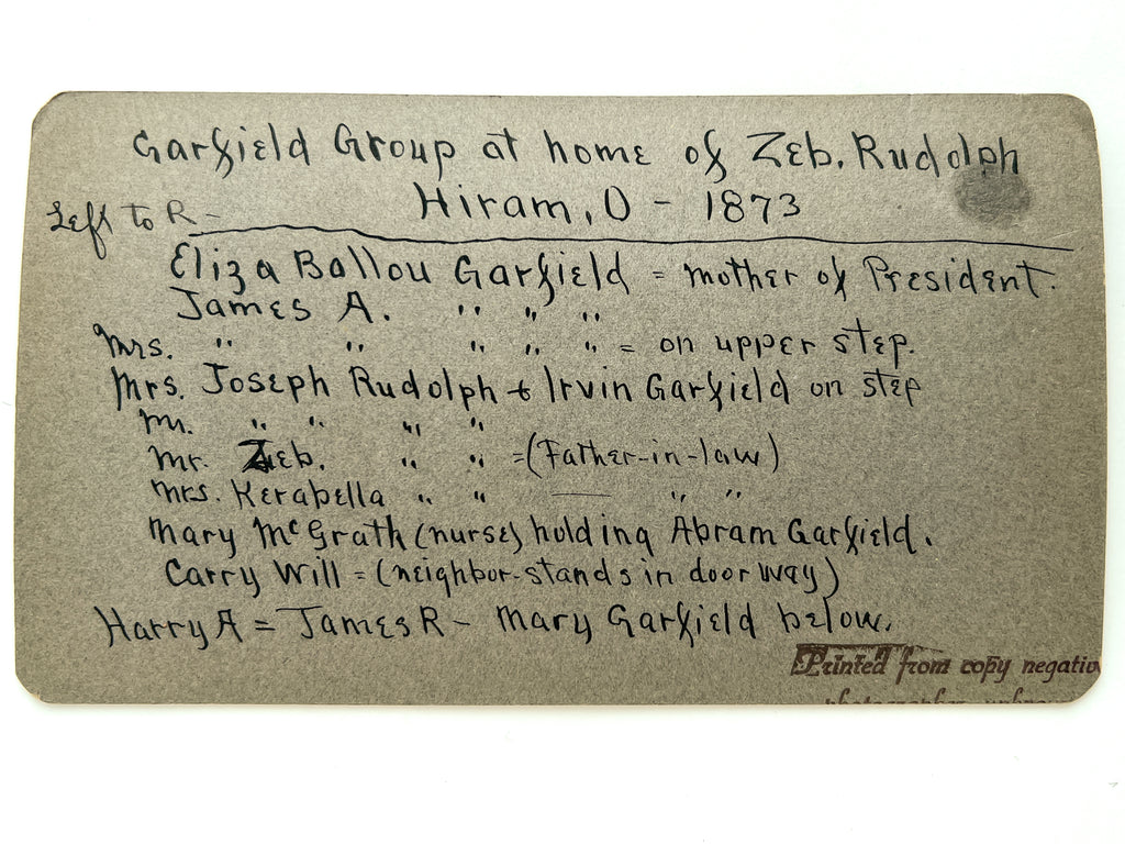 A scarce image of Garfield and extended family at his father-in-law's house. Photograph mounted to card with green coating, approx. 4 x 7 inches. Very Good with light bumping and small abrasion to rear. Labeled in manuscript on verso: "Garfield Group at home of Zeb. Rudolph. Hiram, O - 1873. Left to R -- Eliza Ballou Garfield = mother of President; James A. [Garfield]; Mrs. [James A. Garfield]=on upper step. Mrs. Joseph Rudolph & Irvin Garfield on step... (indicates Mr. Zeb. Rudolph (Father-in-Law); Mrs. Kerabella [Rudolph]; Mary McGrath (nurse) holding Abram Garfield, Carry Will = (neighbor, stands in doorway); Harry A - James R - Mary Garfield below. Verso stamped "Printed from copy negative" with lower line "photographer unknown" cutoff, likely printed ca. 1881.