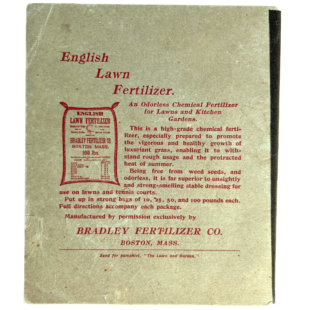 Printed wraps, 5.75 x 5 inches, 24pp. Good with splitting to the front cover along the glue line, attached for just an inch toward the upper edge, light soil. A little treat of typography and plant care tips--keeping insects away, making cuttings, protecting roots. Interspersed with testimonials and ads for Bradley's products, especially their English Lawn Fertilizer.