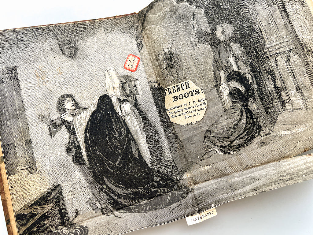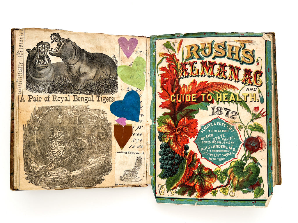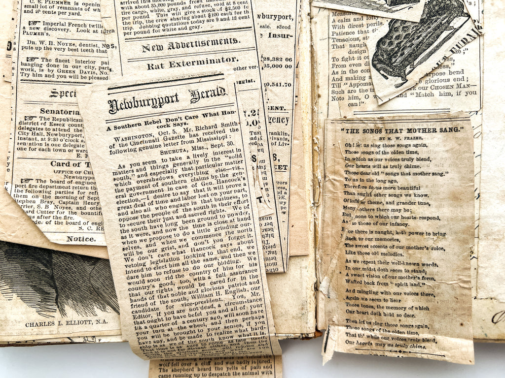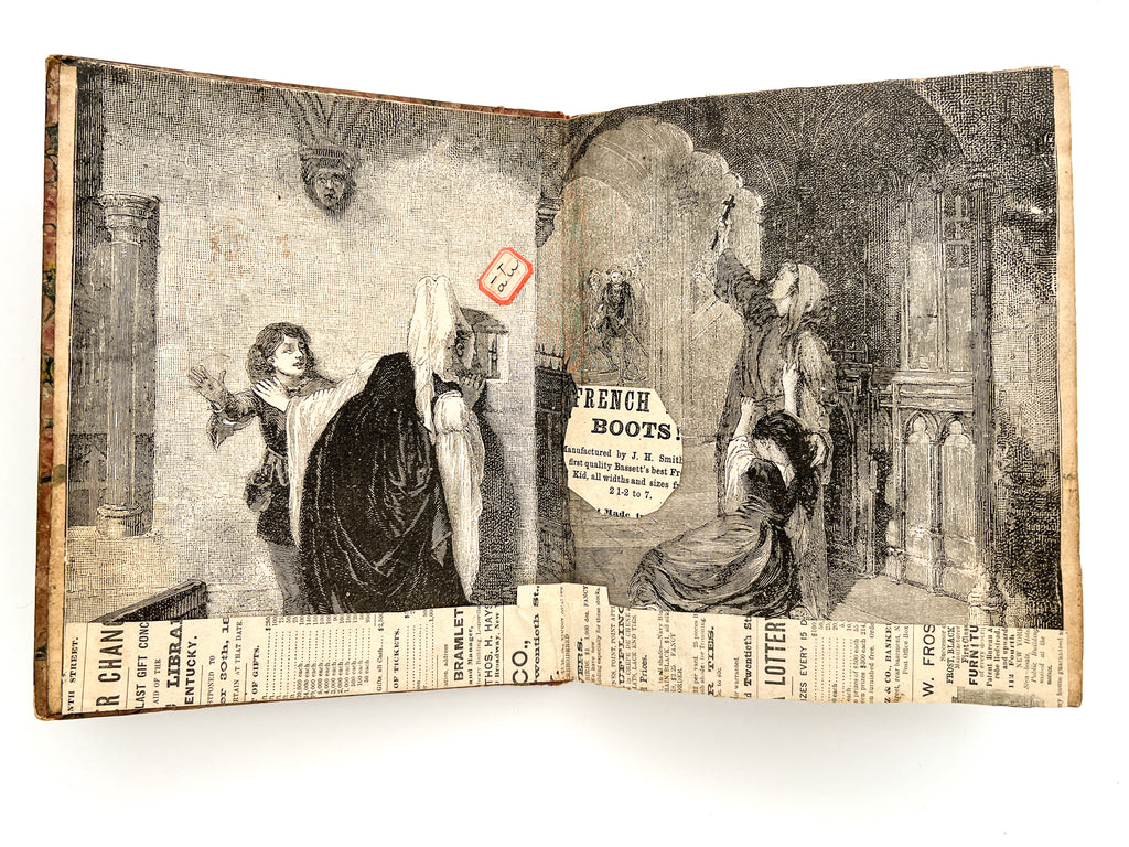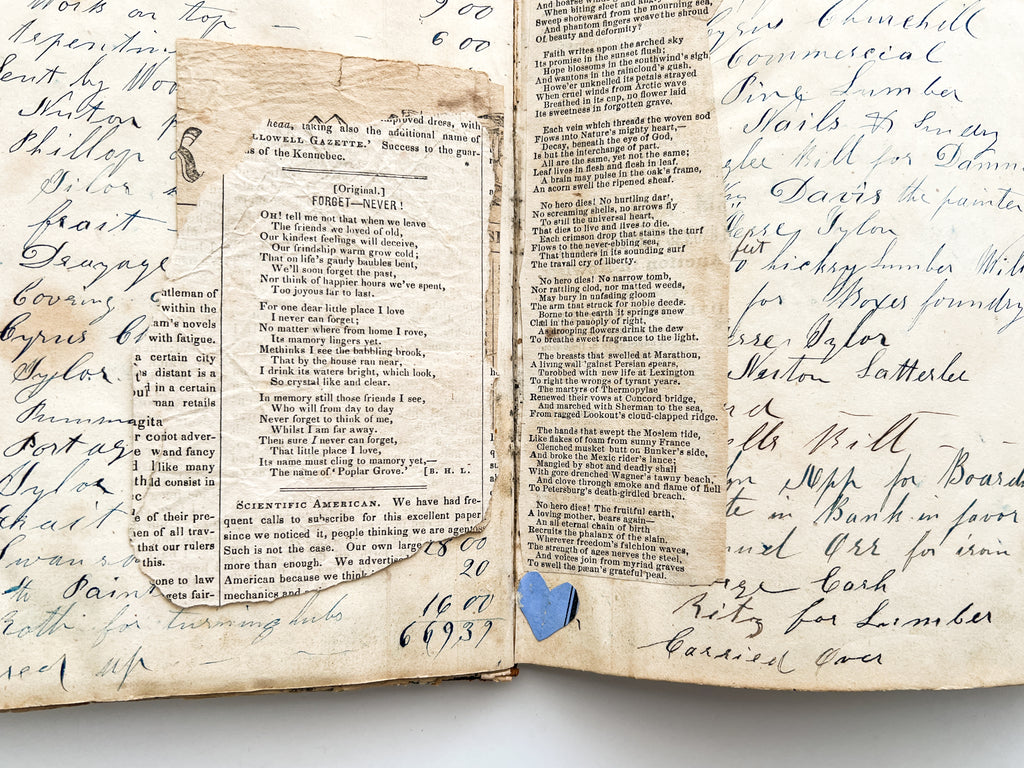 The family's narrative is unclear from the contents, but it is a particularly strong graphic piece and a little window into a man's business and a young girl's world. The scrap content was added in the 1870s. Several drawings and penmanship drills include the signature of "Laura J Plummer 10yrs." Her choices include cutout paper hearts, bright color lithographs produced for Rush's Sarsparilla, pictures of animals, and poems about them, too ("The Monkey," p.13). She's carefully folded in the oversize graphics to charming effect. Newspaper and literary clippings are laid in along with small print graphics from newspaper ads, and assorted ephemera including a gummed label and packing slip. An eclectic collection that serves as a multi-purpose period reference.
