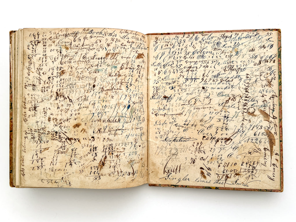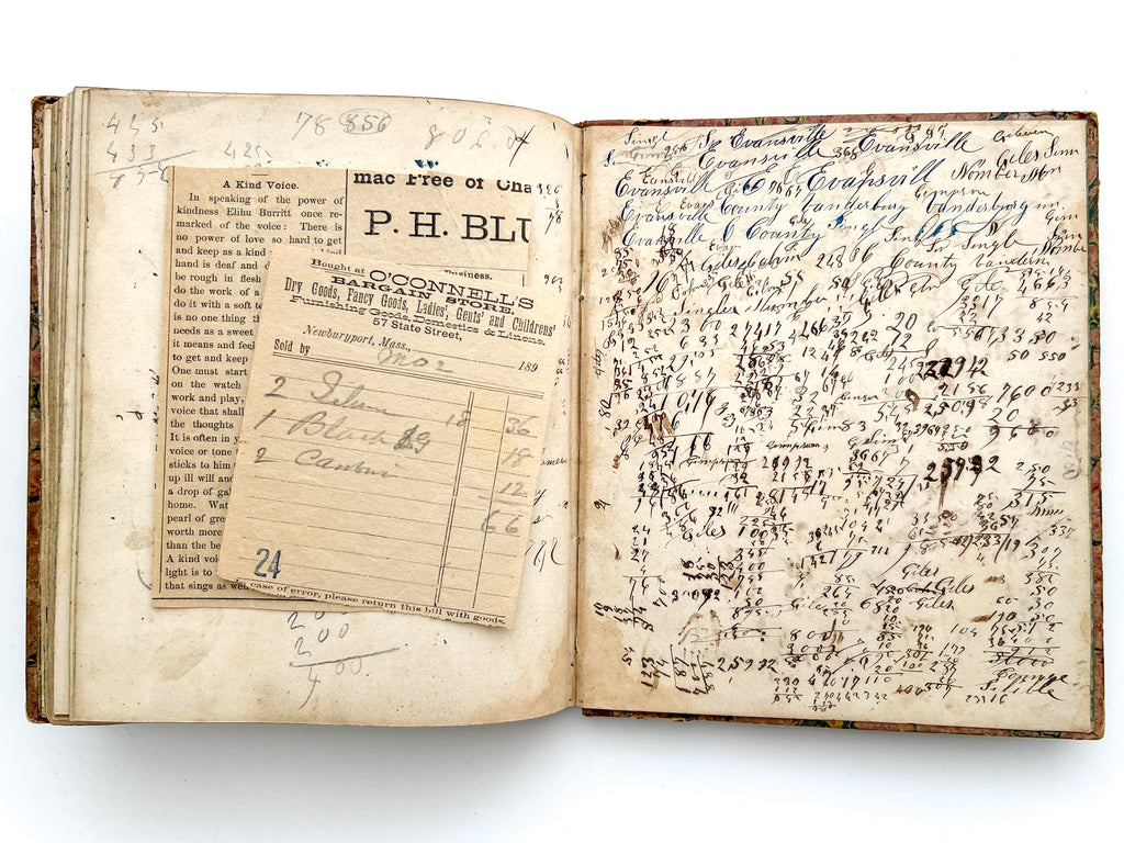 Originally used as a cash book, the earliest entries record job work in 1849—primarily carpentry and furniture making, buggy upholstery and repairs. Entries include "California [body & ironing?]” (75) another “filling Wheel Negro” (20). There are records identifying purchases in Evansville, Indiana from 1856, but most of the ephemera has Massachusetts origins, including receipts and unusual slip notifying of the dissolution of Boston firm George P. Baldwin & Co. Individuals named in the ledger include Giles Cohn (Cohin, etc), Edward B. Edwards, Moses Gilbert, Wilson Gibson and B. Perkins.