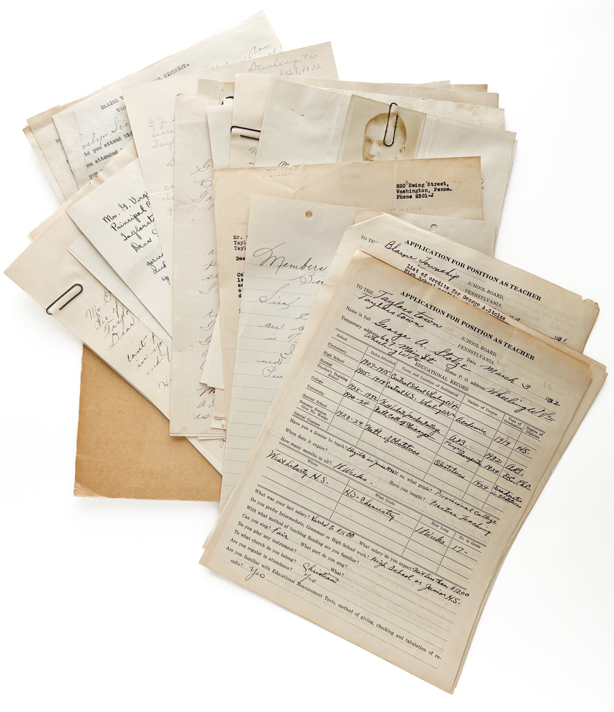 Collection of 22 cover letters and printed applications forms for employment in the Taylorstown School Board, Blaine Township, Washington County, Pa. The majority are from May 1931, made in response to an ad for 7th-8th grade teacher placed in the Washington Observer, including 14 ALS responses and 5 forms. Outliers range from January 1931 through 1933; one is undated.