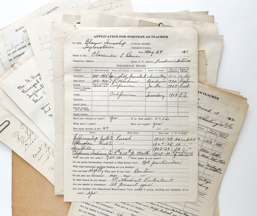 Collection of cover letters and printed applications for teaching positions in Blaine Township, PA, 1931-1932