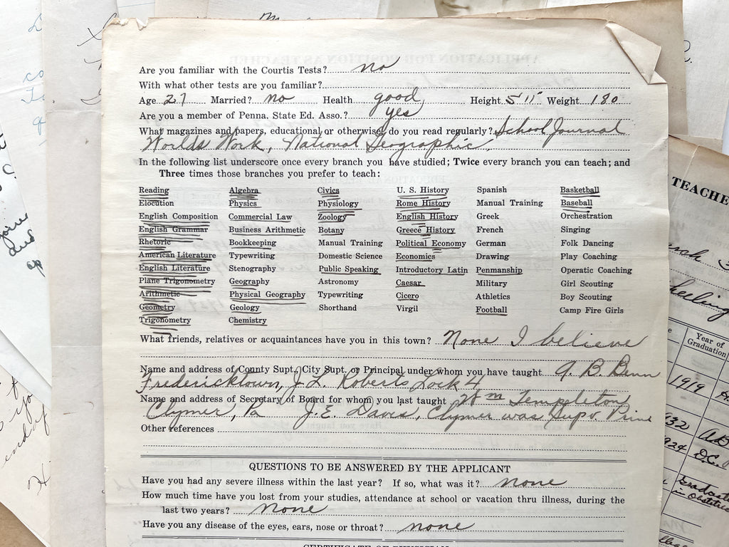 Fields on the application form offer insights into hiring priorities and comparisons to modern employment regulations, asking age, marriage status, height and weight. Questions include, Can you sing? ("Slightly," one replies.) To what church do you belong? Are you regular in attendance? (No one dare say "no.") Applicants are asked to select which topics they have studied (one underscore), can teach (two underscores) and prefer (three underscores) from a list that includes Commercial Law, Manual Training, Caesar, Cicero, Virgil, Folk Dancing, Play Coaching, Operatic Coaching and Stenography. "Manual Training" is listed twice. The printed application asks about familiarity with educational testing, namely the Courtis Tests—standardized reading exams developed in the early 20th century.