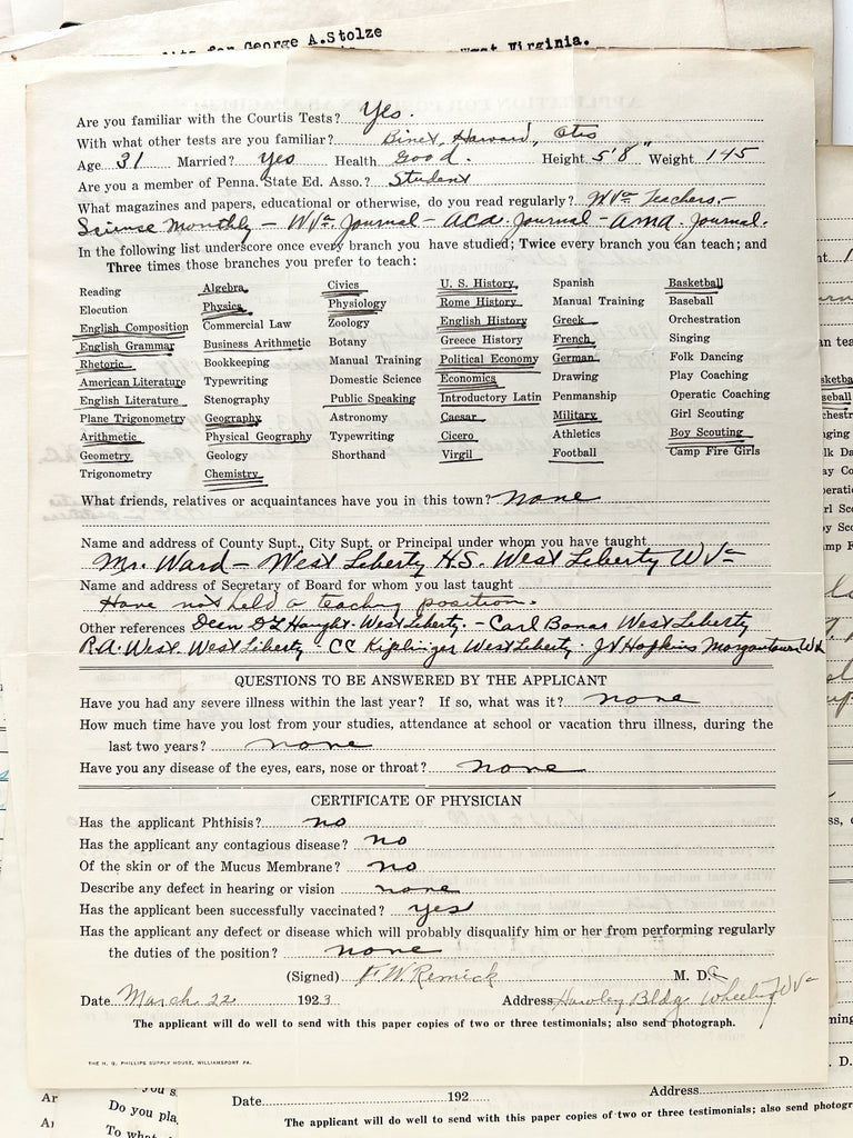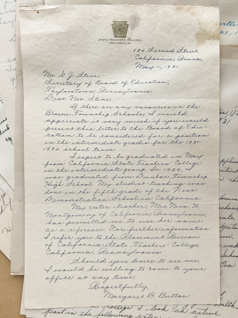 The proximity to the Normal School in California, PA is reflected in the applicants. Margaret B. Button has even written on State Teachers College letterhead in perfect Palmerian penmanship. Those with less direct training have also applied, possibly indicative of the wider nets cast in Depression-era job searches. George A. Stolze, who has no teaching experience, but studied Physio-Therapeutics and Obstetrics from 1920-1924, but had recently enrolled in teachers' college and was looking to be paid no less than $1200 for his first gig (previously making $1500). Another applicant wrote "Minimum" for salary requirement.