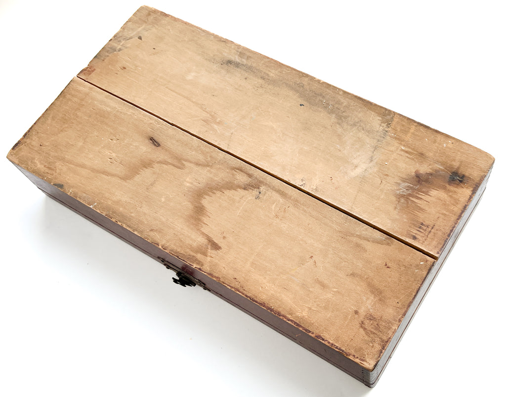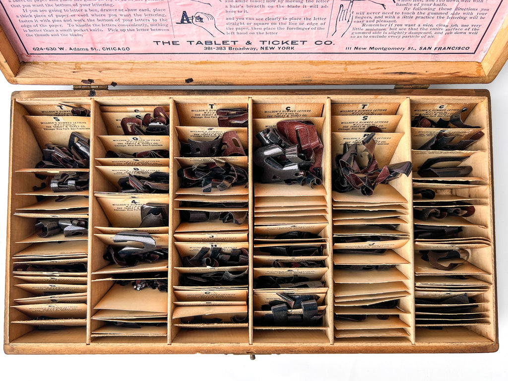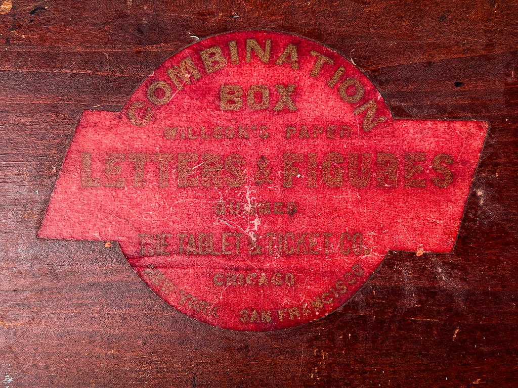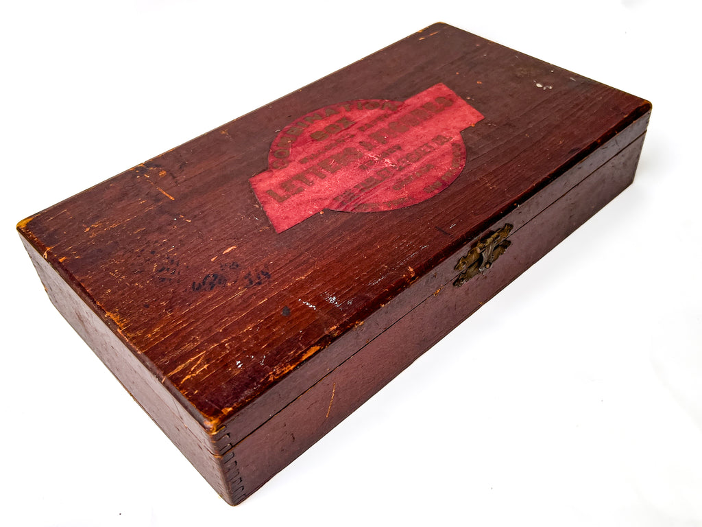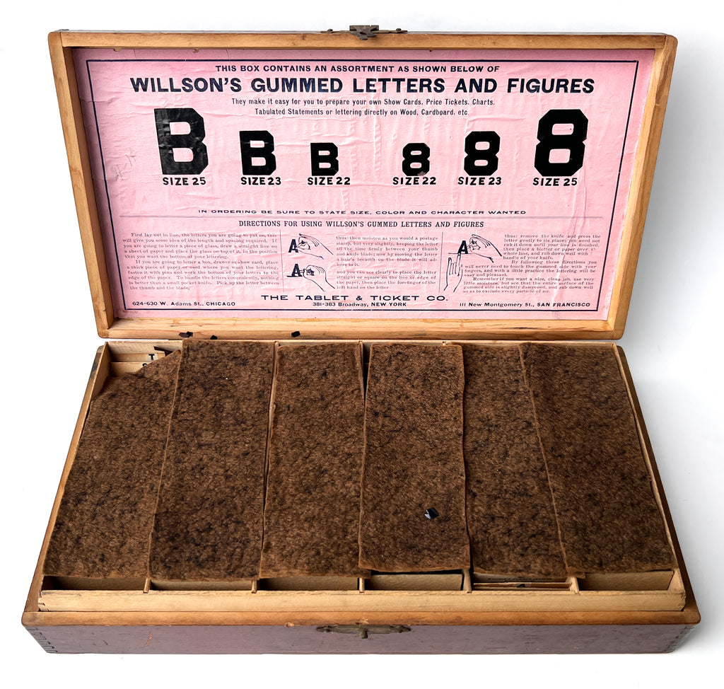 A very exciting box of gummed letters and figures. 7 x 13 x 2.5 inches. Bottom of the lid made from two pieces of wood that are bowing at the center, general scuffing to box exterior. Clasp still functional. With felt strips to absorb any moisture, helping to keep the letters separate. Lid graphic faded, but a handsome box and nice overall object with lots of gummed letters still present.