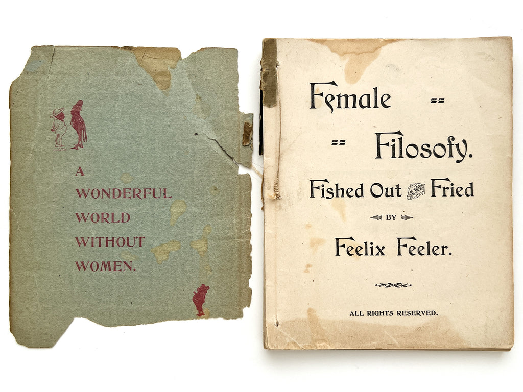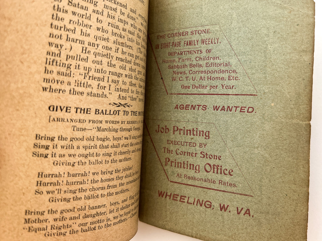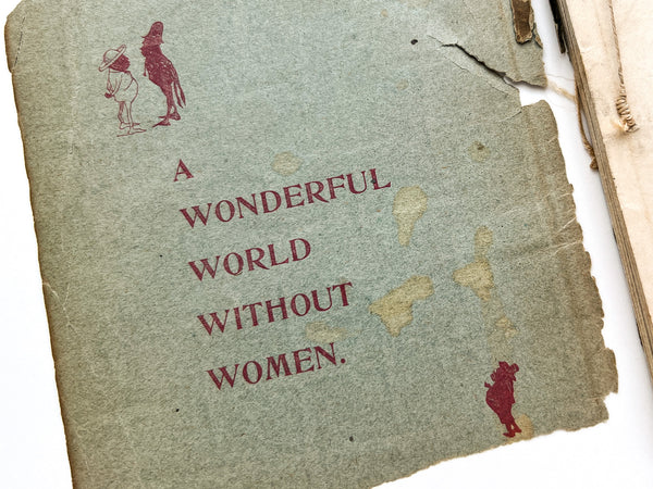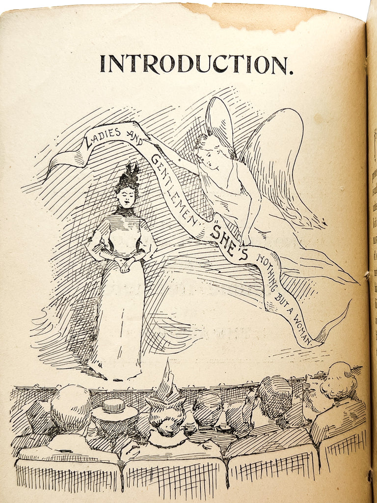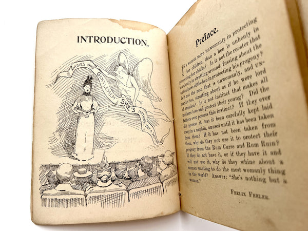 Softcover 16mo, 108pp. One plate illustration opposite the preface, with the text: "Ladies and Gentlemen, She's Nothing But A Woman." Good+: cover is detached and suffers a loss to the bottom edge that affects the printed border (not text), loss to spine covering and chipping to corners. Textblock is Very Good with a receding tidemark at the top edge of the first few leaves after a stain on the title page. Inner wrap advertises job printing by the publisher, as well as a "family weekly" with a WCTU section.