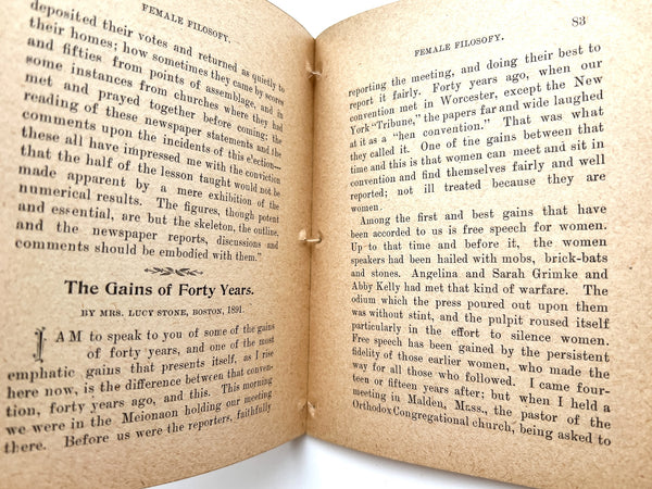 A heavily tongue-in-cheek walk through the state of Women’s Suffrage and popular objections to women voting—from the polls being an unfit place, to women being too dumb, or that "only bad women will vote." One section is attributed to Lucy Stone ("The Gains of Forty Years," p82); a poem on the last page is after Rebecca Hazard ("Give Mothers the Vote").