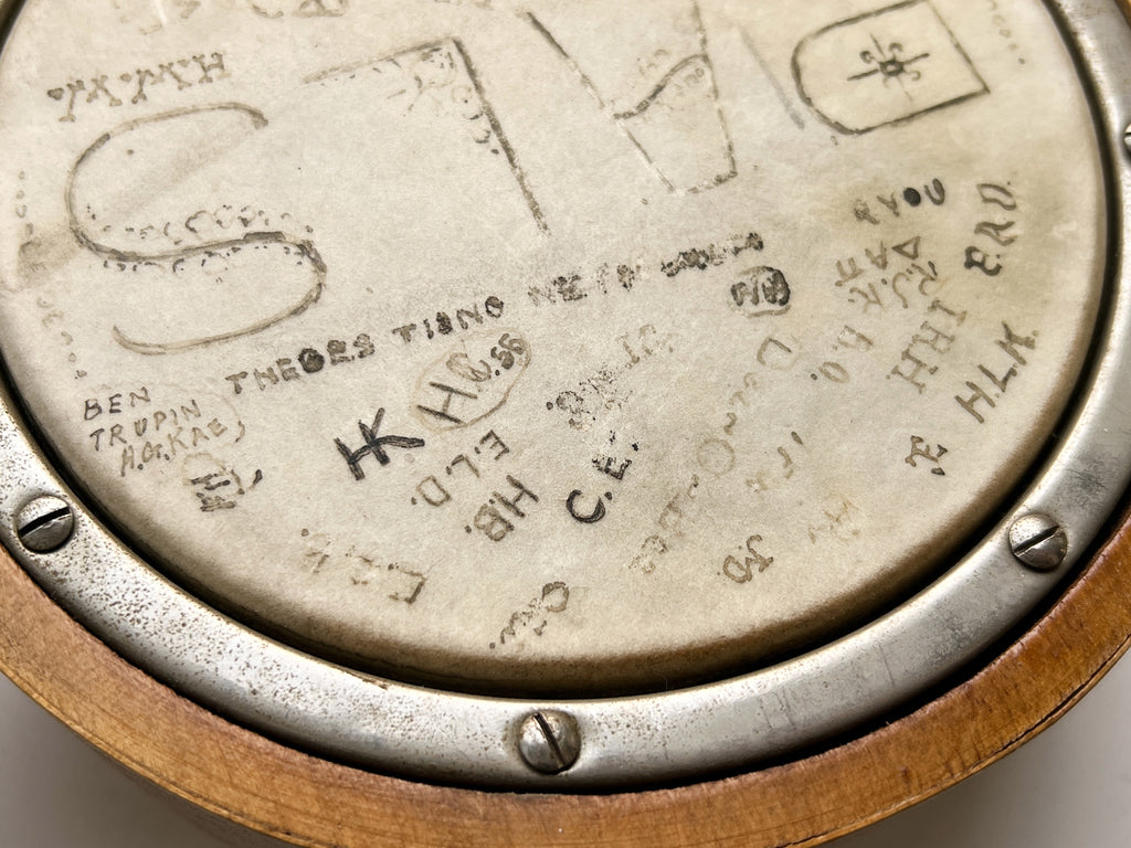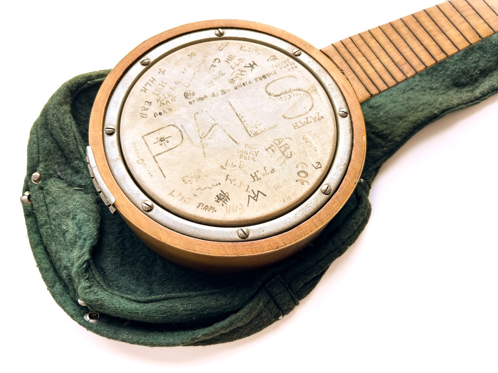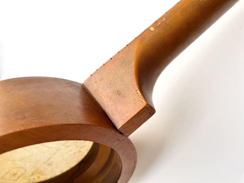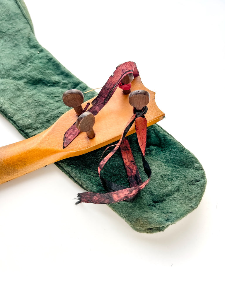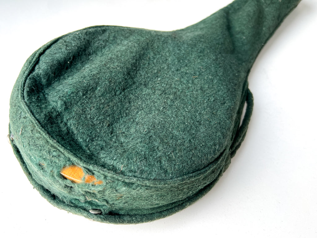 Why have your friends sign an autograph book when they can inscribe your banjolele? Overall size 20.5 x 7.5 x 3.5 inches. From Western Pennsylvania, signed "M.O. '23 / R.H.H.S," presumably a high school. Felted wool cover with snap closures; a tight fit with holes worn through at the tuning pegs and base. The cover sheds a fair bit, but sure is cute. Old ribbon around the wooden tuning pegs, nice crazing to the lacquer. Remnants of a string on one of the pegs is evidence it was once functional--and could be again?