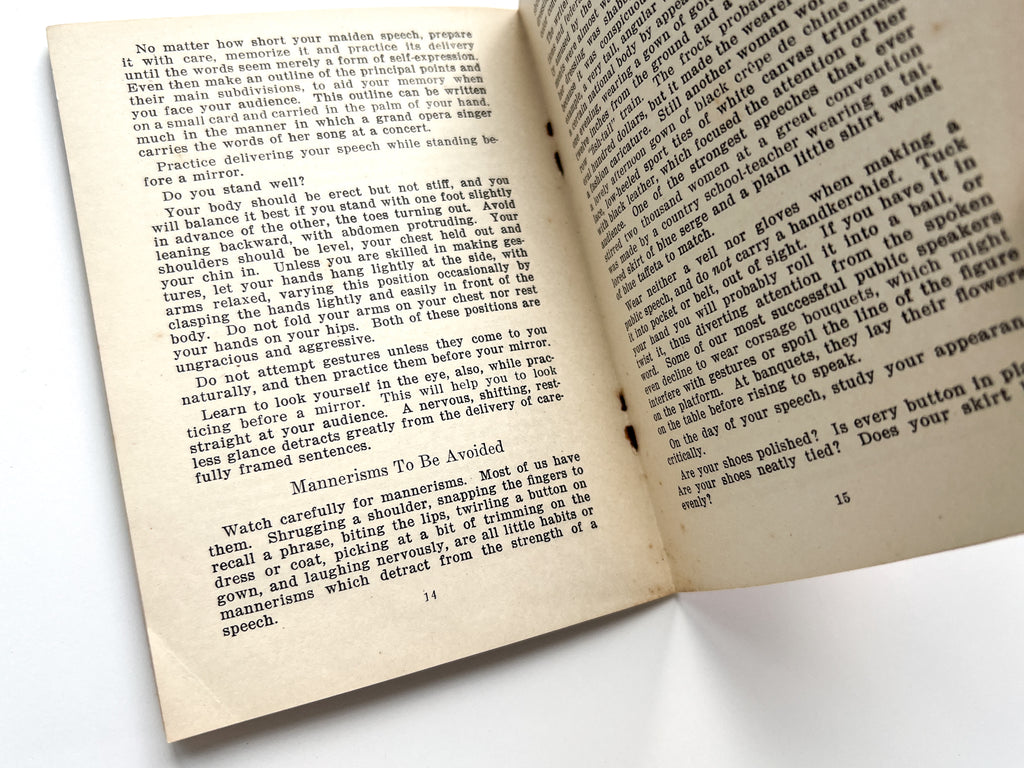 Avoid both over-dressing and slovenliness of any sort, also violent color contrasts in your costume." Don't hold a handkerchief. Don't wear a veil or gloves. Polish your shoes. Printed red paper wraps, 26pp. From a series of pamphlets from "The Good Citizenship Bureau, Woman's Home Companion"--this one written by its director, Anna Steese Richardson. OCLC locates 1 copy dated 1922 with only 24 pages.