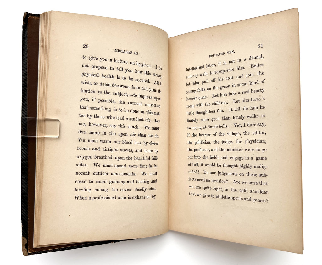 The necessity of physical conditioning for performing mental labor is a recurring point, with another emphasis on social development. "We must cease to count gunning and boating and bowling among the seven deadly sins... Let him have a little thoughtless fun. It will do him infinitely more good than lonely walks or swinging at dumb bells." (20) He encourages the young graduates to stay current with advancements in their fields, as well as study outside their primary disciplines—to generally keep in touch with the world around them, avoiding the mistakes of narrow mindedness and tunnel vision.