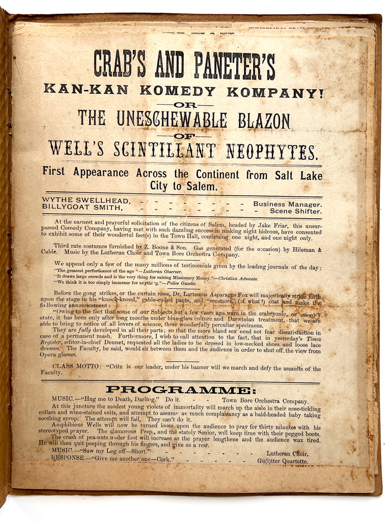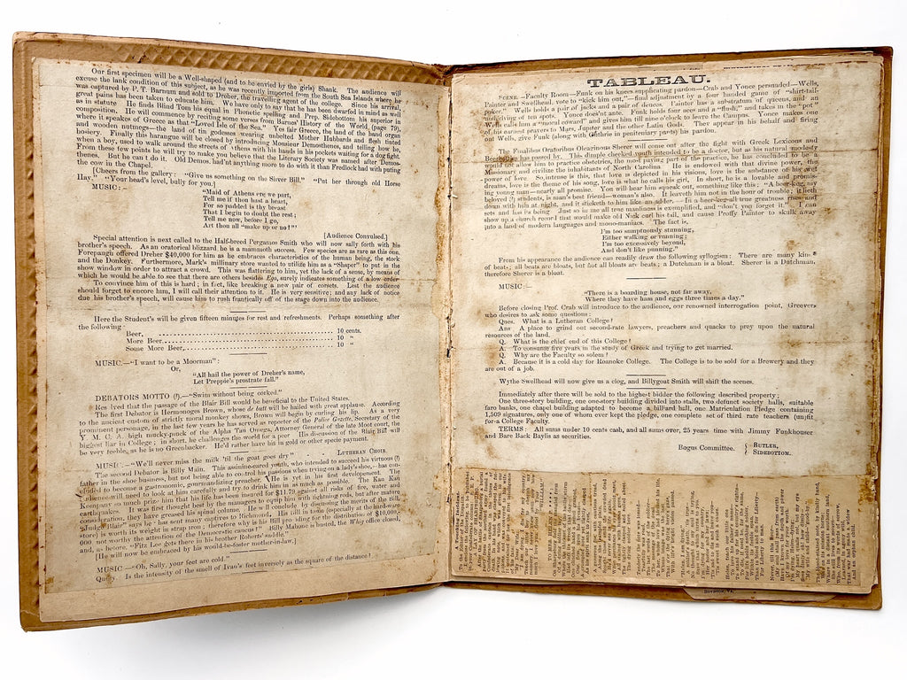 The first item, pasted across 3 pages, is a bogus program for “Crab’s and Paneter’s Kan-Kan Komedy Kompany, or the Uneschewable Blazon of Well’s Scintillant Neophytes. First Appearance Across the Continent from Salt Lake City to Salem,” which satirized Roanoke College professors and proceedings. Promising music, debate, and sideshow-like spectable, it reads, in part: “Owing to the fact that some of our Subjects, but a few years ago were in the embryonic, or monkey state, it has been only after long months under bluegrass culture and Darwinian treatment, that we are able to bring to notice of all lovers of science, these wonderfully particular specimens.”