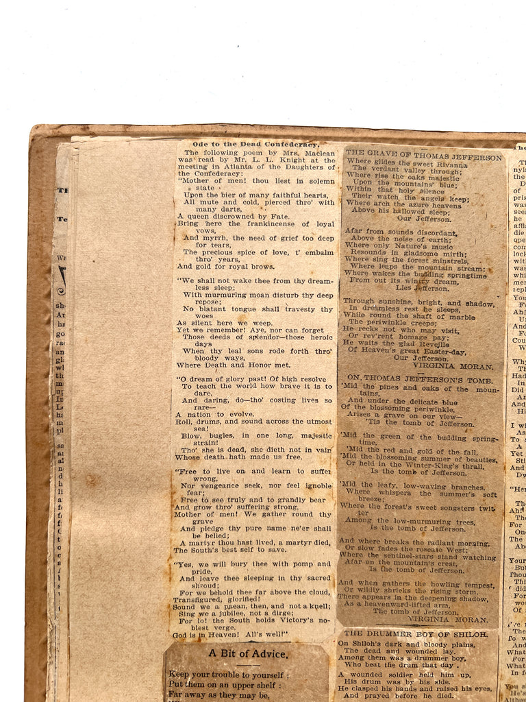 A late 19th-century Southern scrapbook—most likely compiled by a woman, based on the format and inclusion of items like “Whittlings from the Block of Experience” by Clara J. Denton. Notable for containing a rare piece of Roanoke College ephemera and its overall glimpse at how the Confederacy was memorialized in popular media a few decades after the Civil War.