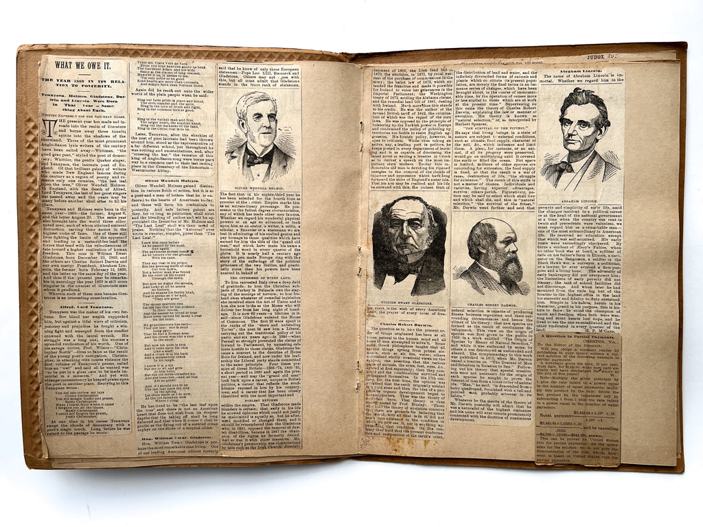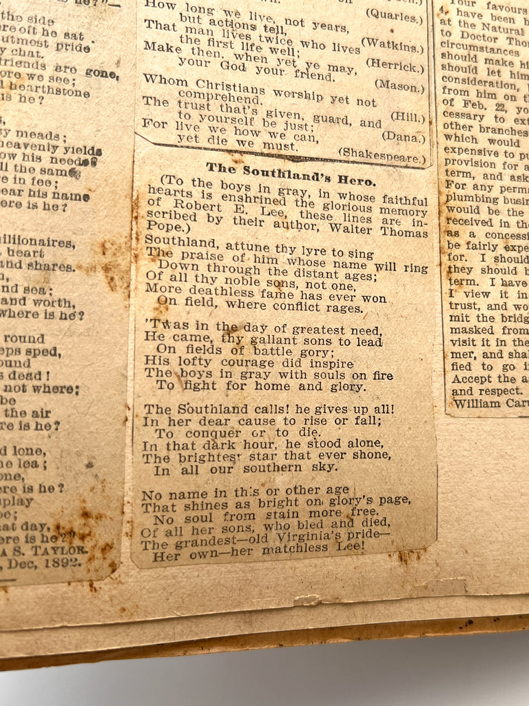 The remainder of the album contains newspaper clippings that represent a mix of regional sentimentalism with literary and historical interest. Several items betray Confederate sympathies articulated as Southern pride, including “The Southland’s Hero,” a poem by Walter Thomas Pope, dedicated, “To the boys in gray, in whose faithful hearts is untried the glorious memory of Robert E Lee…,” the lyrics of “Stonewall Jackson’s Way,” a note purportedly found in the hand of a dying Confederate soldier at the Battle of Sharpsburg, and the unambiguous, “Ode to the Dead Confederacy.” Other material, however, celebrates Lincoln and Darwin, potentially underscoring an ideological gap in the history of what the Confederacy stood for, versus its ongoing glorification in popular media celebrating it as "cultural heritage" without acknowledging what it really represented—a lingering debate. It remains a question whether the compiler of the scrapbook, likely born just after the Civil War, understood the implications of their Confederate romanticism.