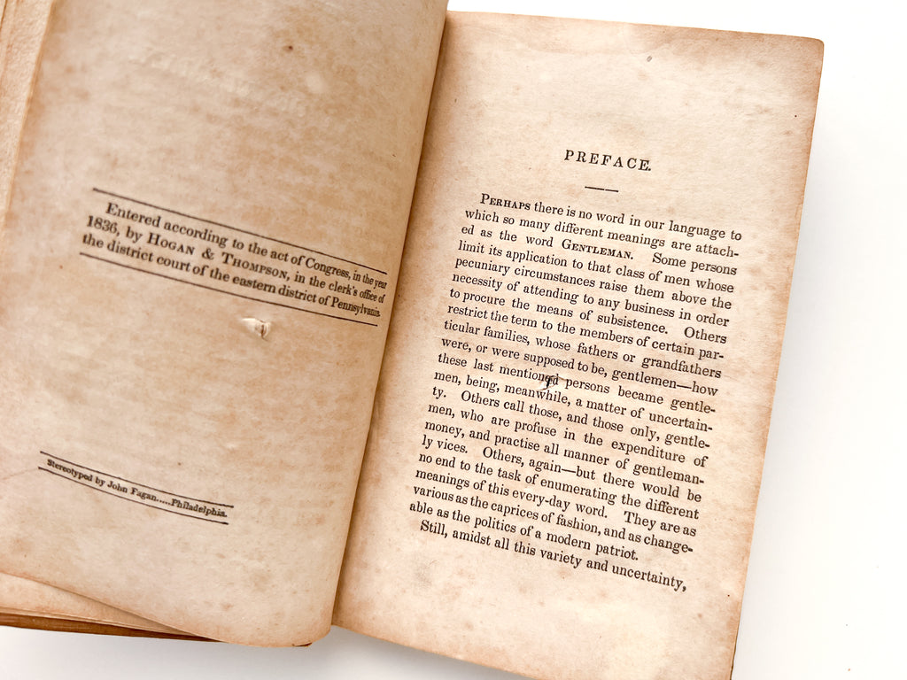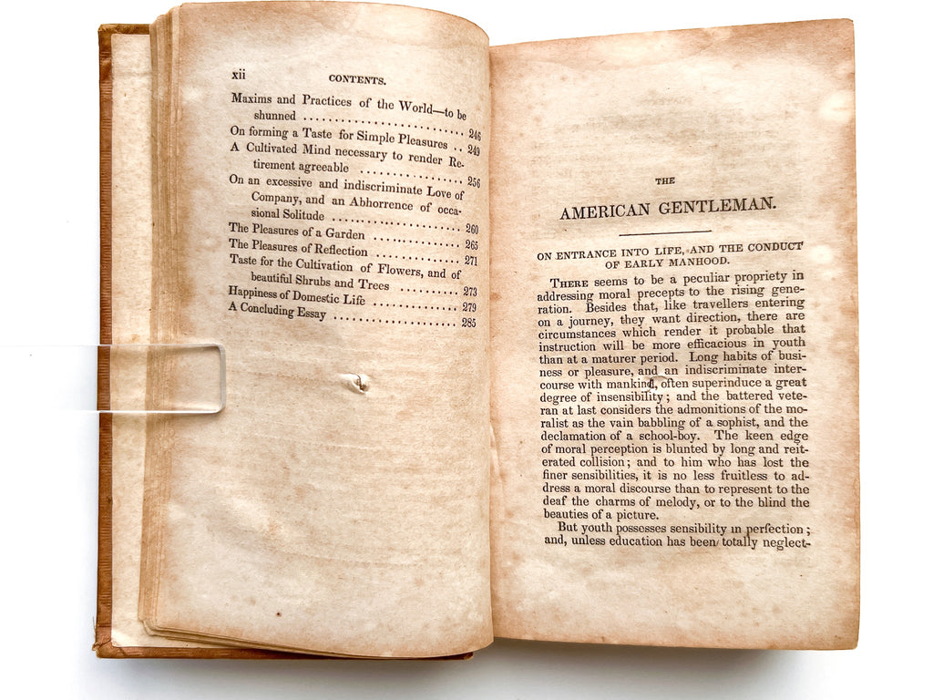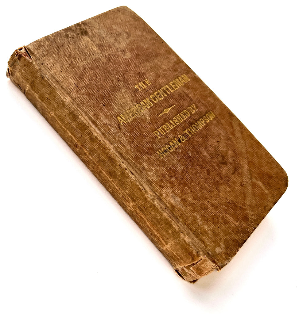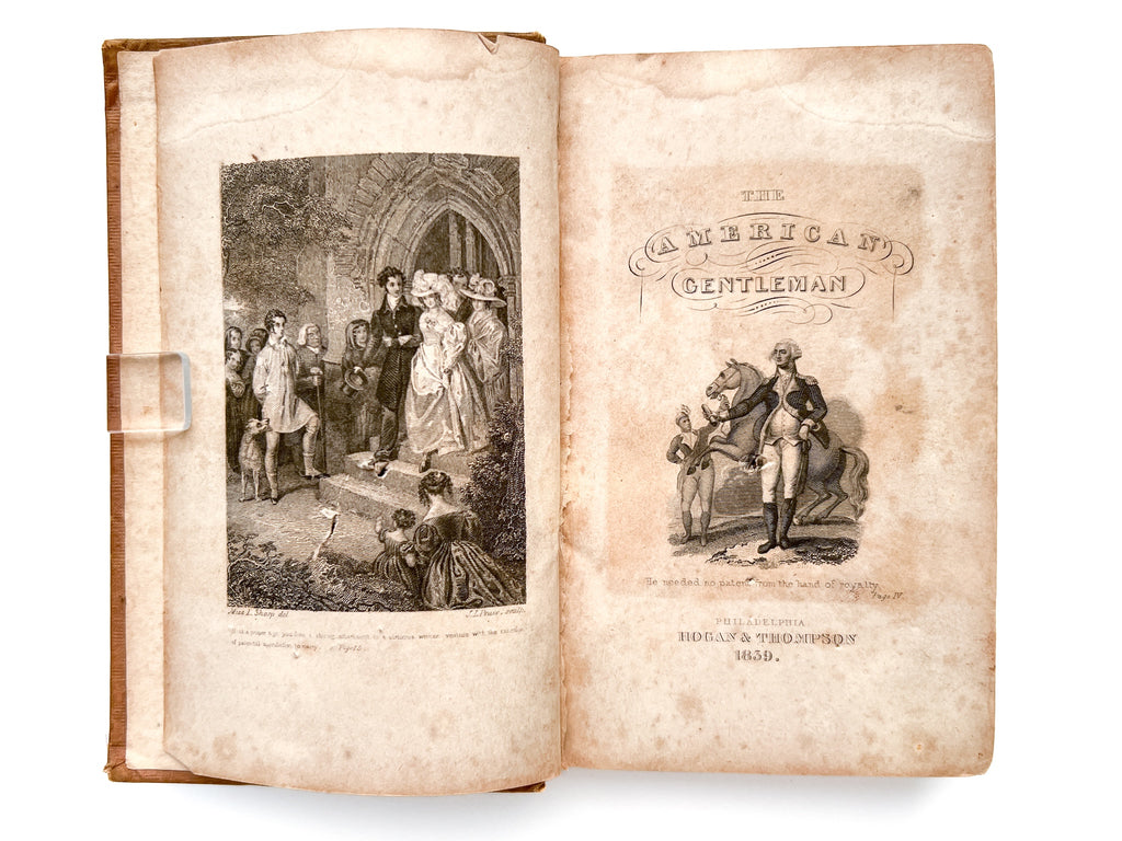 Early reprint; original copyright 1836. 18mo, 288pp. In attractive publisher's cloth with subtle dot pattern and gilt-stamped title. Moderate sunning and wear to extremities, including a quarter-inch loss at the heel. A characterful copy, stabbed in very ungentlemanly manner leaving a small puncture and impression through p31, but not affecting the legibility of the text. Engraved frontis and title page with more notable disruption, but camouflaged in the print. Pencil ciphering to rear endpapers; signature to front. Frontis of a wedding scene illustrated by Miss L. Sharp; title features vignette of George Washington, whom the author denotes as the model of American Gentleman-hood. Well-represented in institutions, but scarce in commerce.