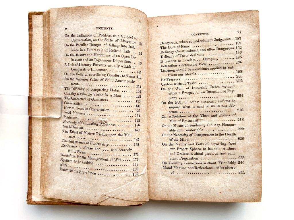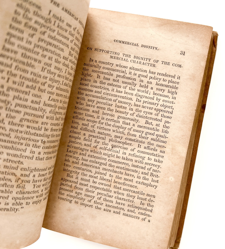 Particular attention to "commercial dignity," noting that the American merchant class aspired to gentility and addresses the rise of "modern" riches. Chastity and Temperance are, of course, virtues; notable social guidance is supplied, "On the Folly of being anxiously curious inquire what is said of us in our Absence," and "On the Vanity and Folly of departing our Proper Sphere to become and Orators without previous and sufficient Preparation."